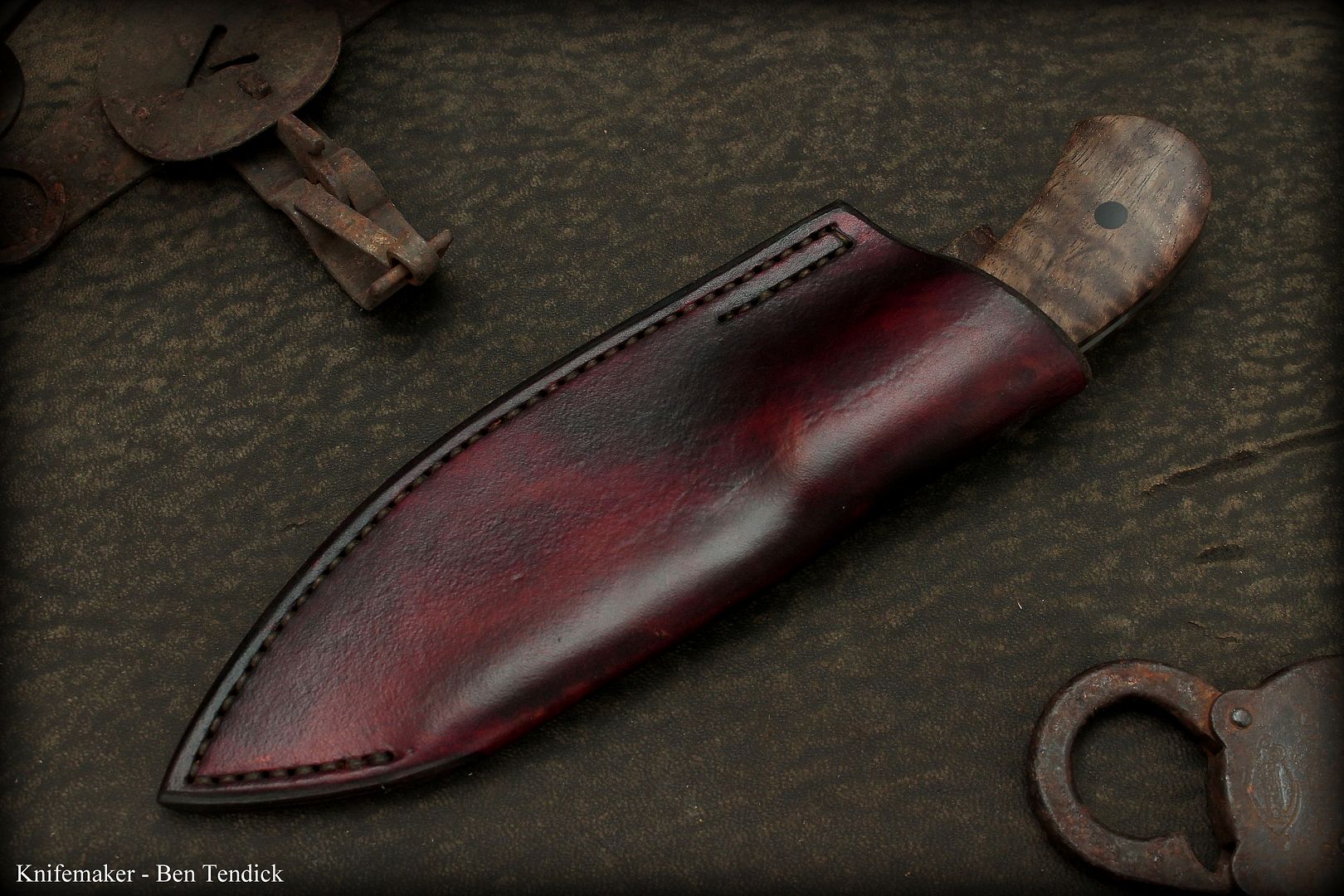 The sheath is hand dyed andstitched veg tan leather with a wax finish. It is heavy duty and water resistant.