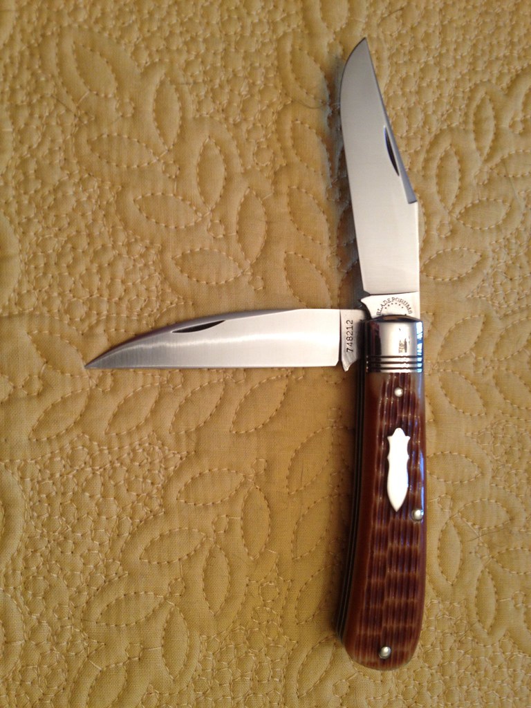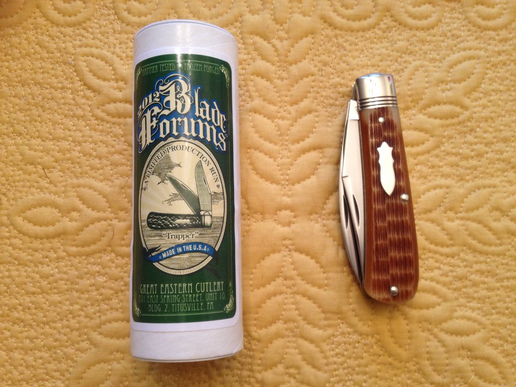 1) 2012 GEC Bladeforums Wharncliff Trapper $OLD. Carried for a bit and has some tiny patina spots. Wharncliff blade was not sharpened at the factory and is dull, I never got around to sharpening it. Purchased new last year.
