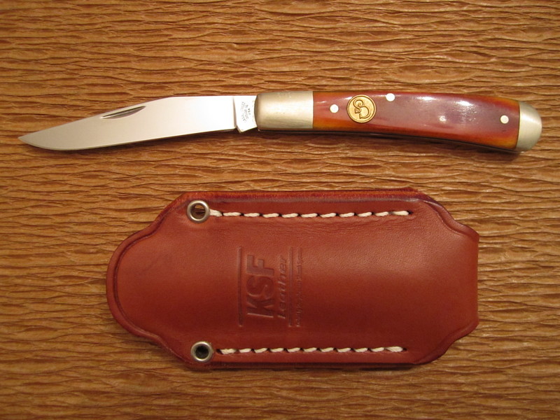3) Canal Street Cutlery Half Moon Trapper, Smooth sunset bone, KSF leather pocket sheath, with box, bolsters have been matted by scotchbright pads, CC #19, $75.00