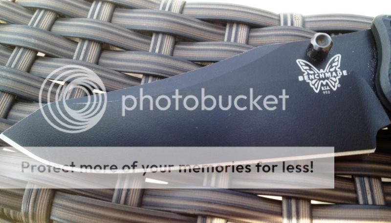 Black G10 handle and black, PE blade with 154CM steel. Knife is lightly used and well-cared for. There are a few, faint scratches near blade tip. Handle is in perfect shape. Perfect centering, no blade play. This comes with a generic Benchmade box.