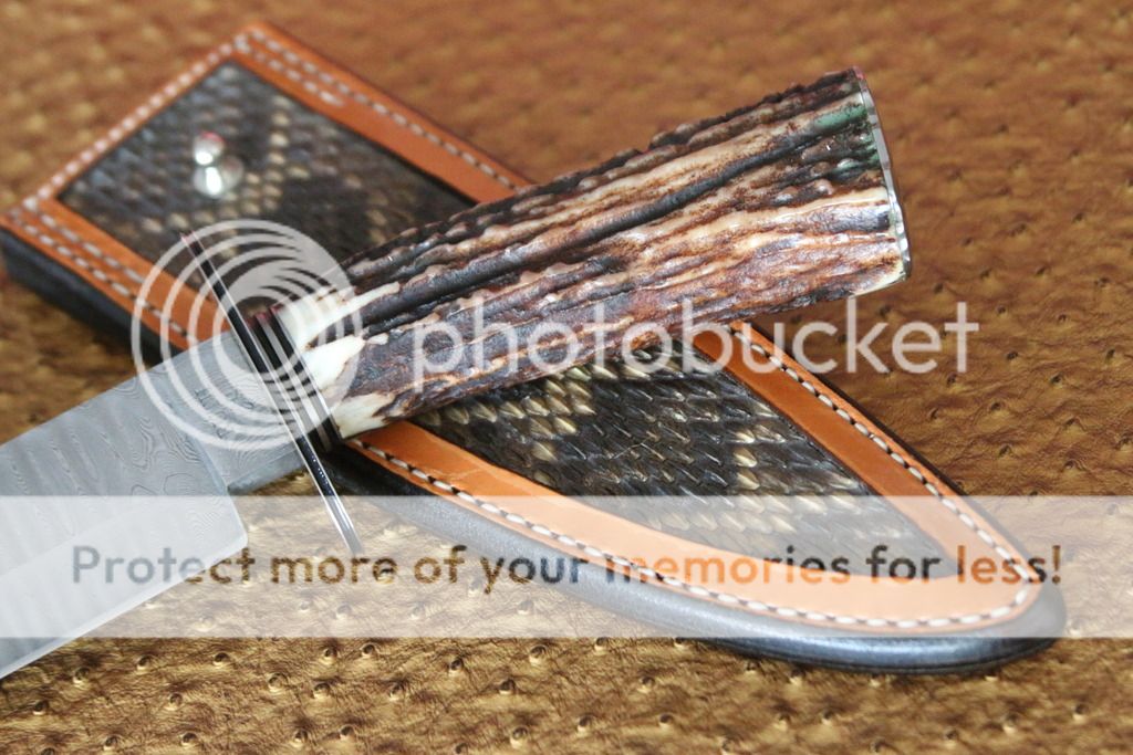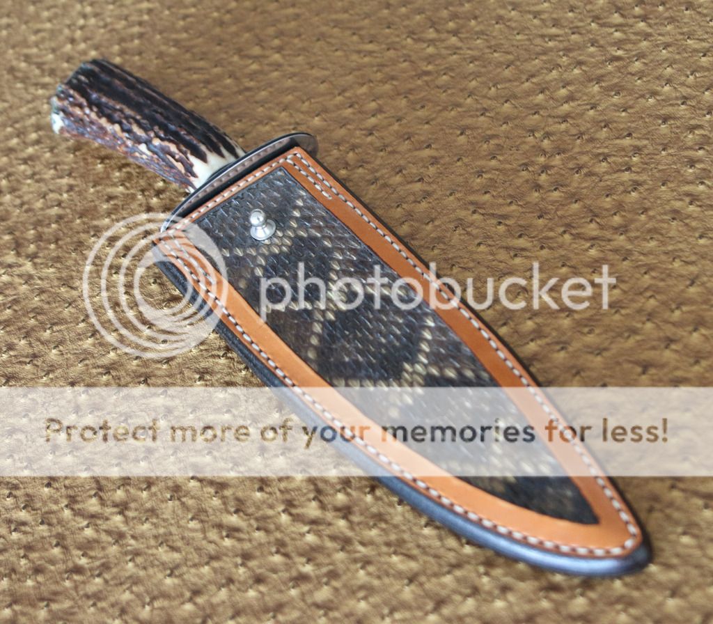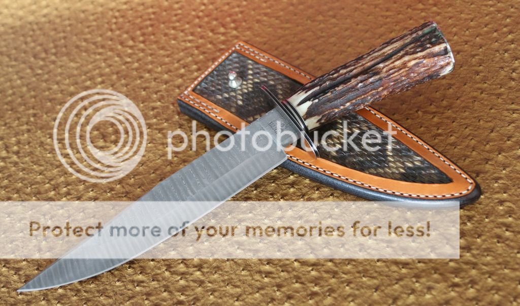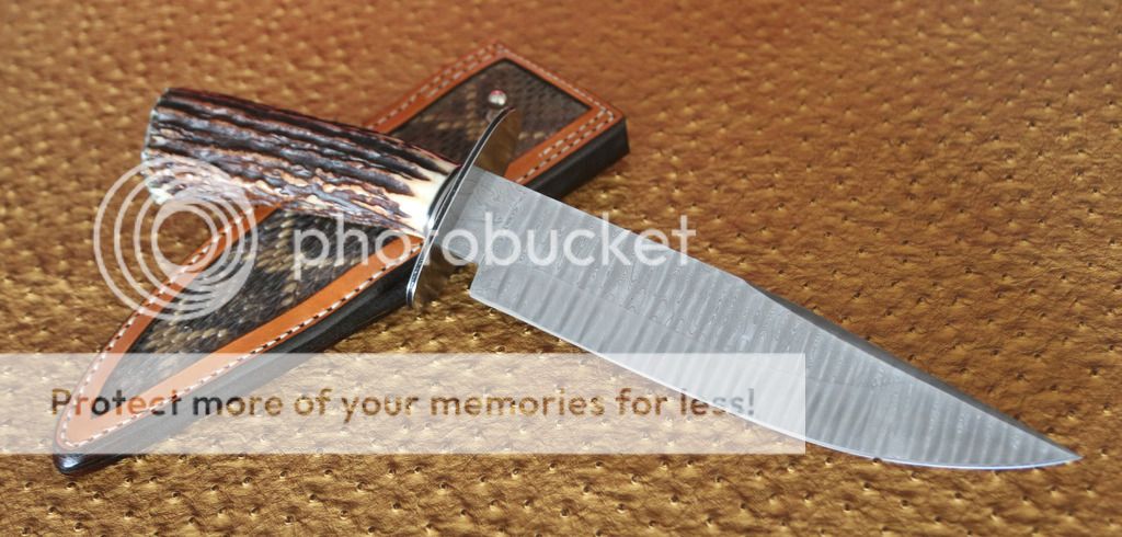 pig_sticker Feedback: +0 / =0 / -0 Joined Apr 4, 2006 Messages 95 Aug 2, 2015 #2 This is a Mike Ruth Sr, JS Bowie Excellent Condition, Never Used. Ladder Pattern Damascus 1084/15N20 Excellent Sambar Stag Handle BL: 8.5" OAL: 14' Kenny Rowe Leather Sheath with a Western Diamondback Rattlesnake Inlay Asking $900 obo shipping included Ships to USA only.
