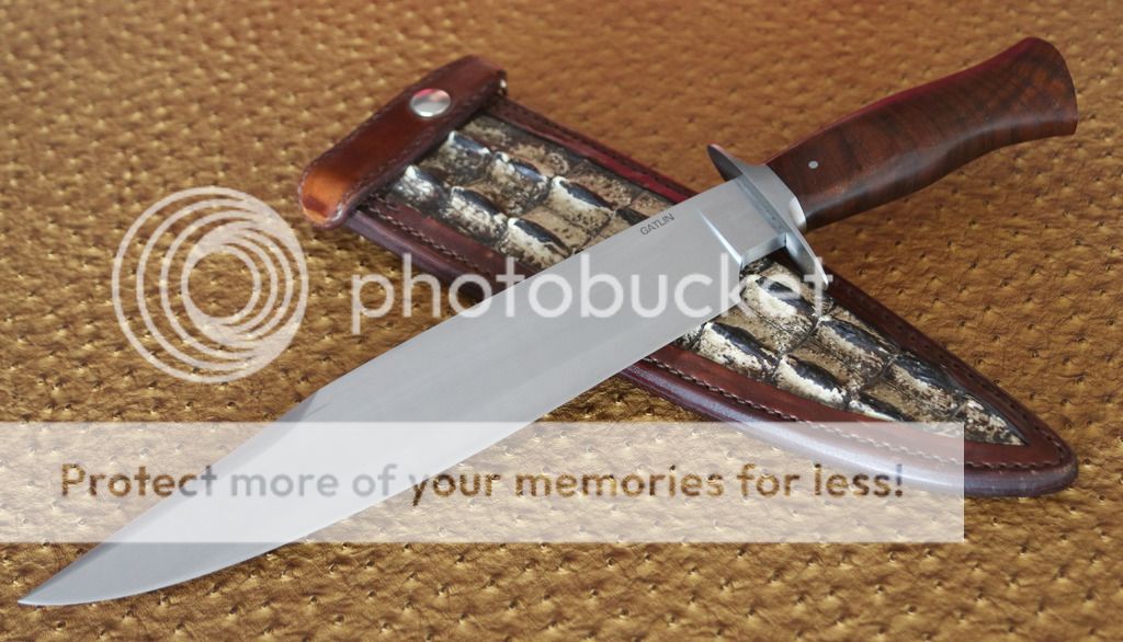 pig_sticker Feedback: +0 / =0 / -0 Joined Apr 4, 2006 Messages 95 Aug 2, 2015 #1 This is a Brett Gatlin user knife I have up for sale. Handle: Walnut Blade: 5160 BL: 11" OAL: 16" Custom Sheath from Kenny Rowe leather with gator inlay. Asking $700 obo shipping included. Ships to USA only.
