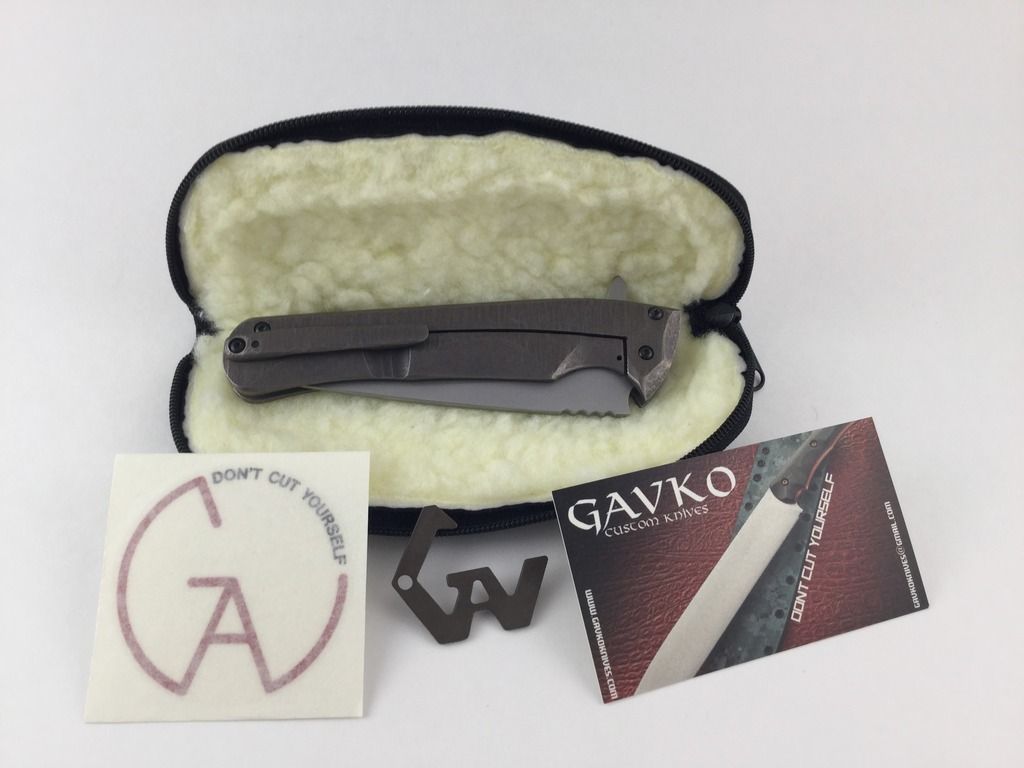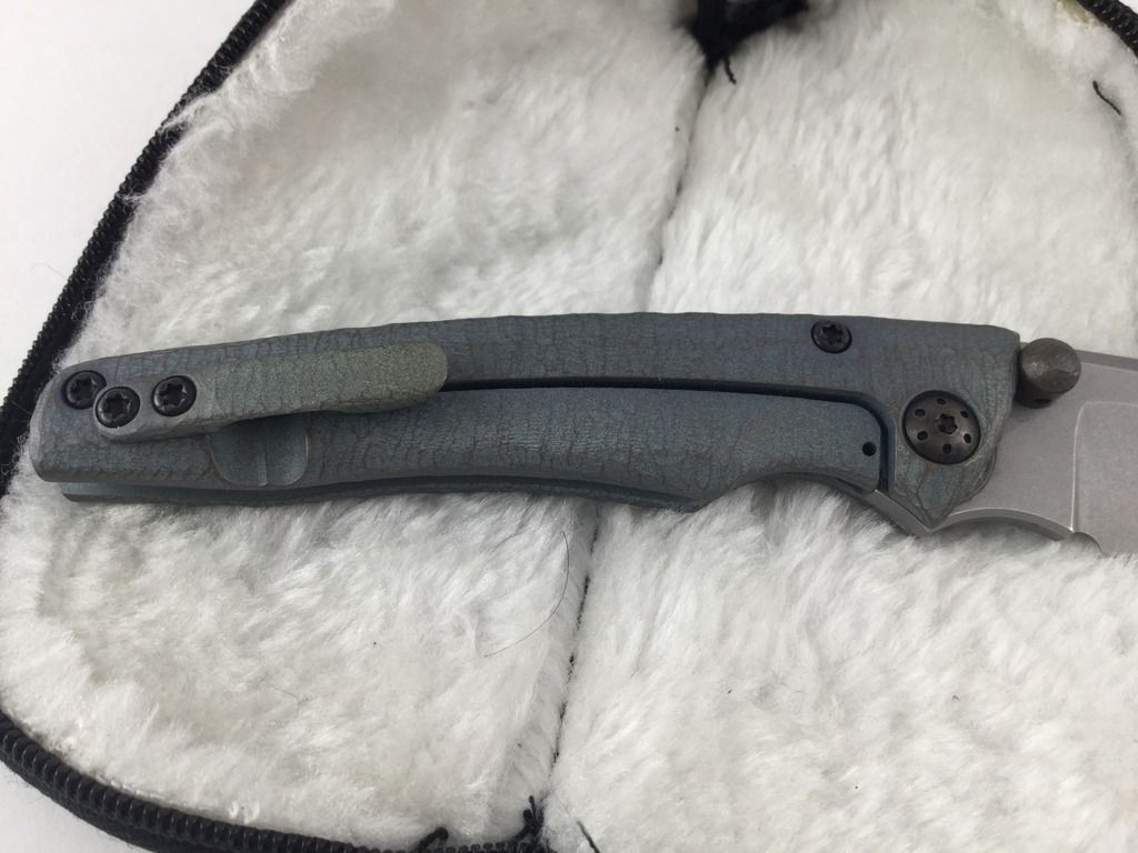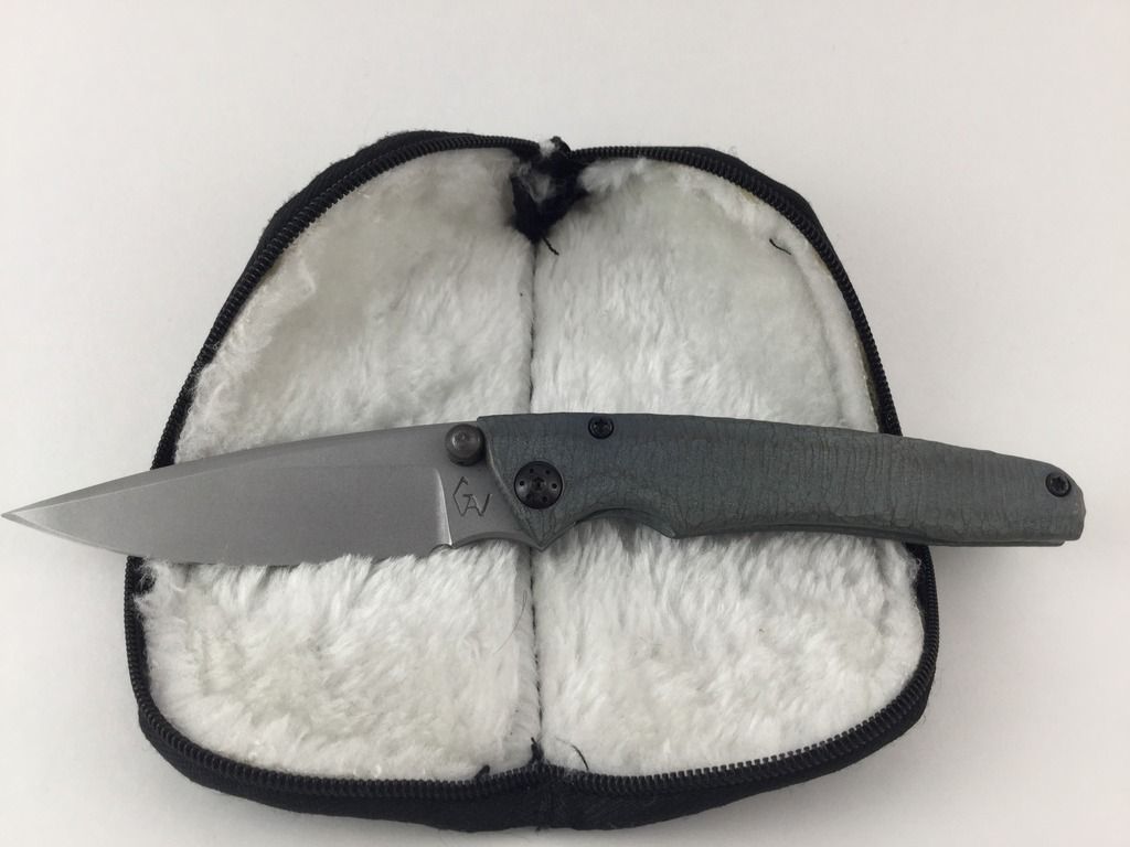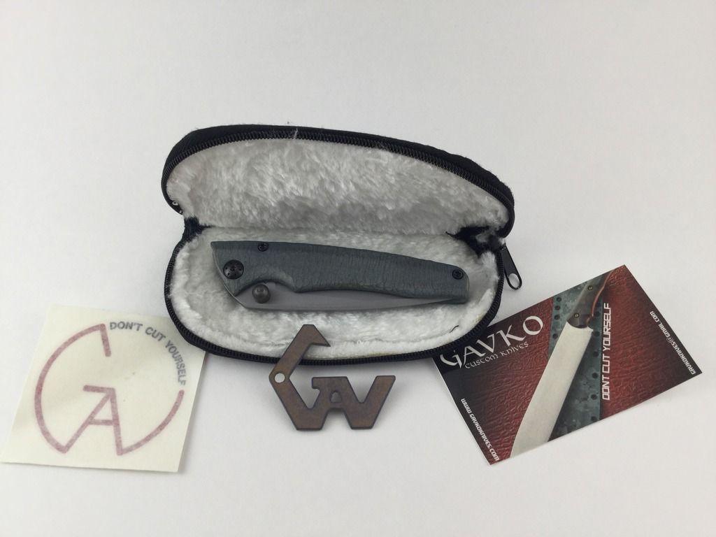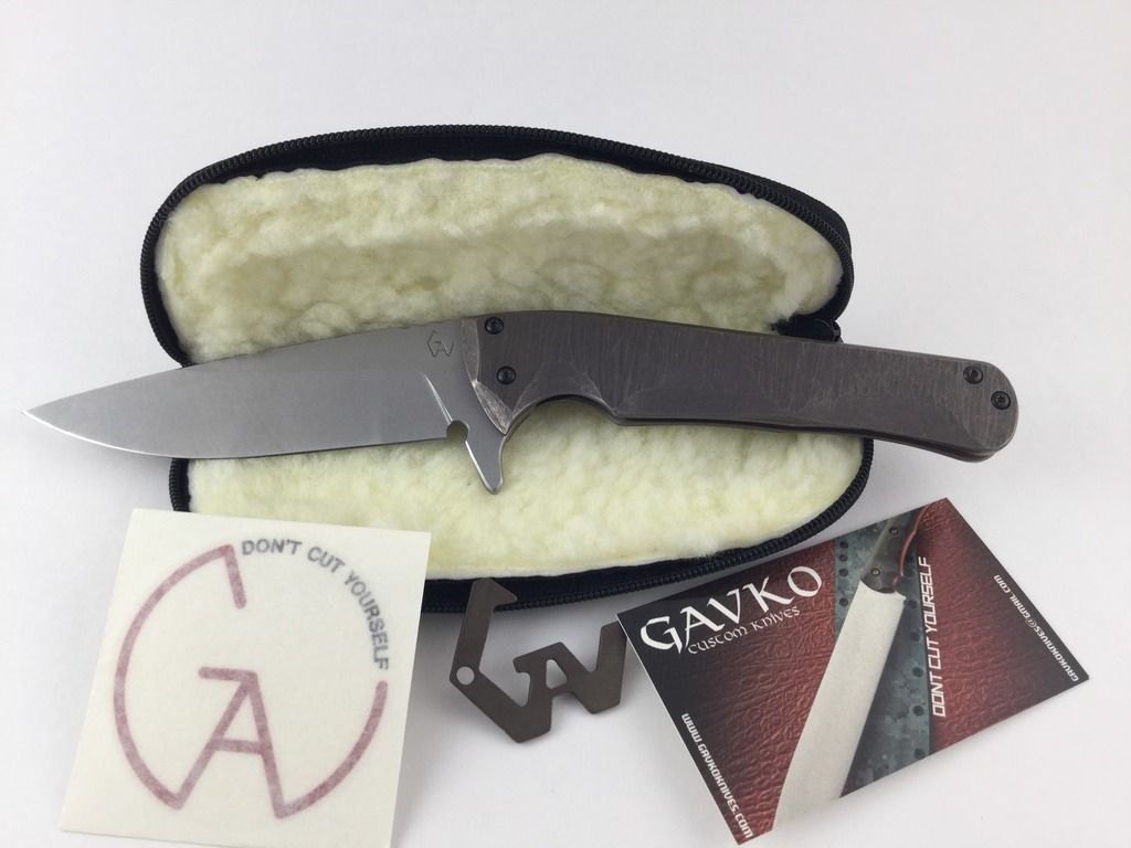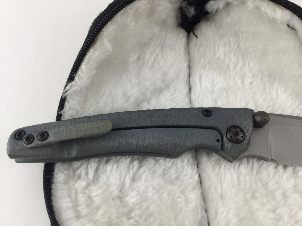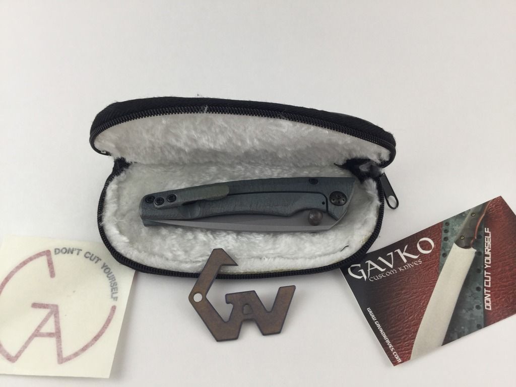 4. Gavko 2.0 flipper: This is an earlier model Gavko knife and is still extremely smooth. This knife was just sent back to Michal for a loose pivot and he put fresh Loctite in it. 4" Blade Length about 8 1/2" overall, super slim carry knife at about 1cm thickness throughout! Super sharp blade and no cosmetic issues at all with a tree bark finish.