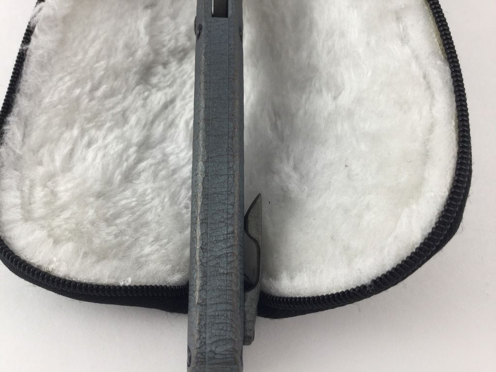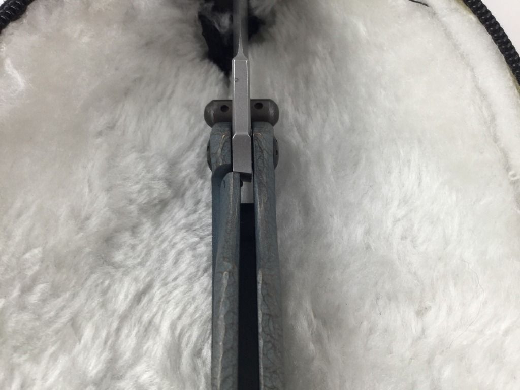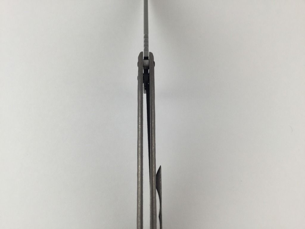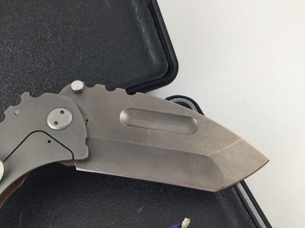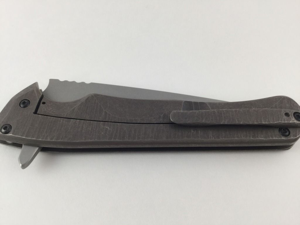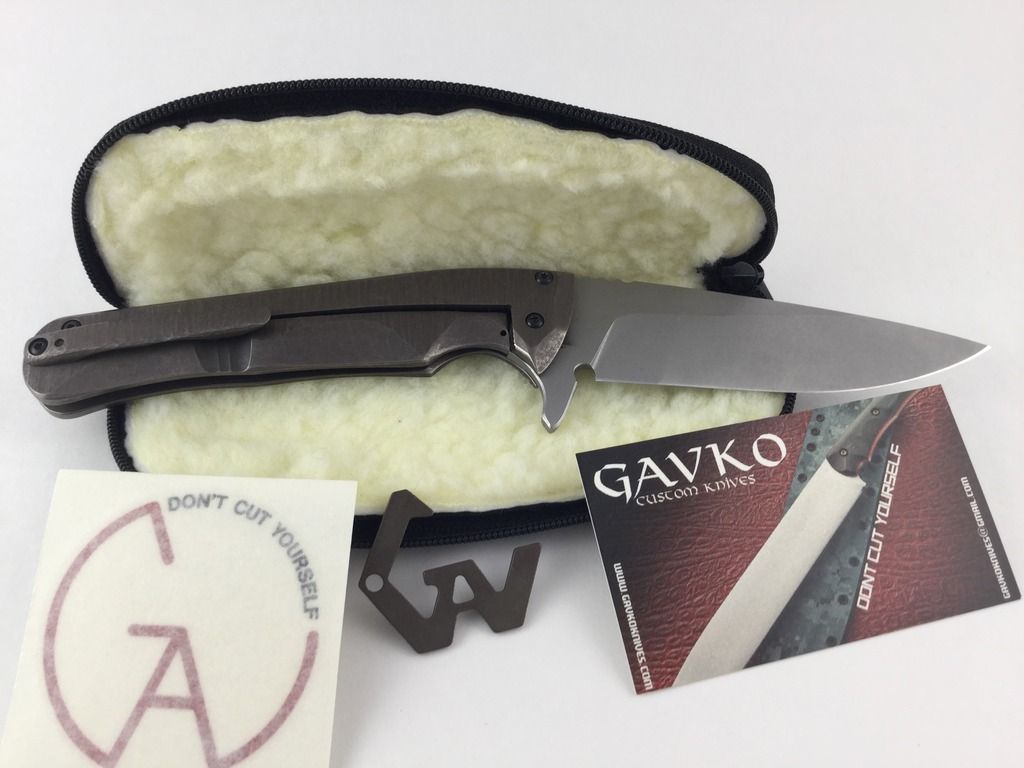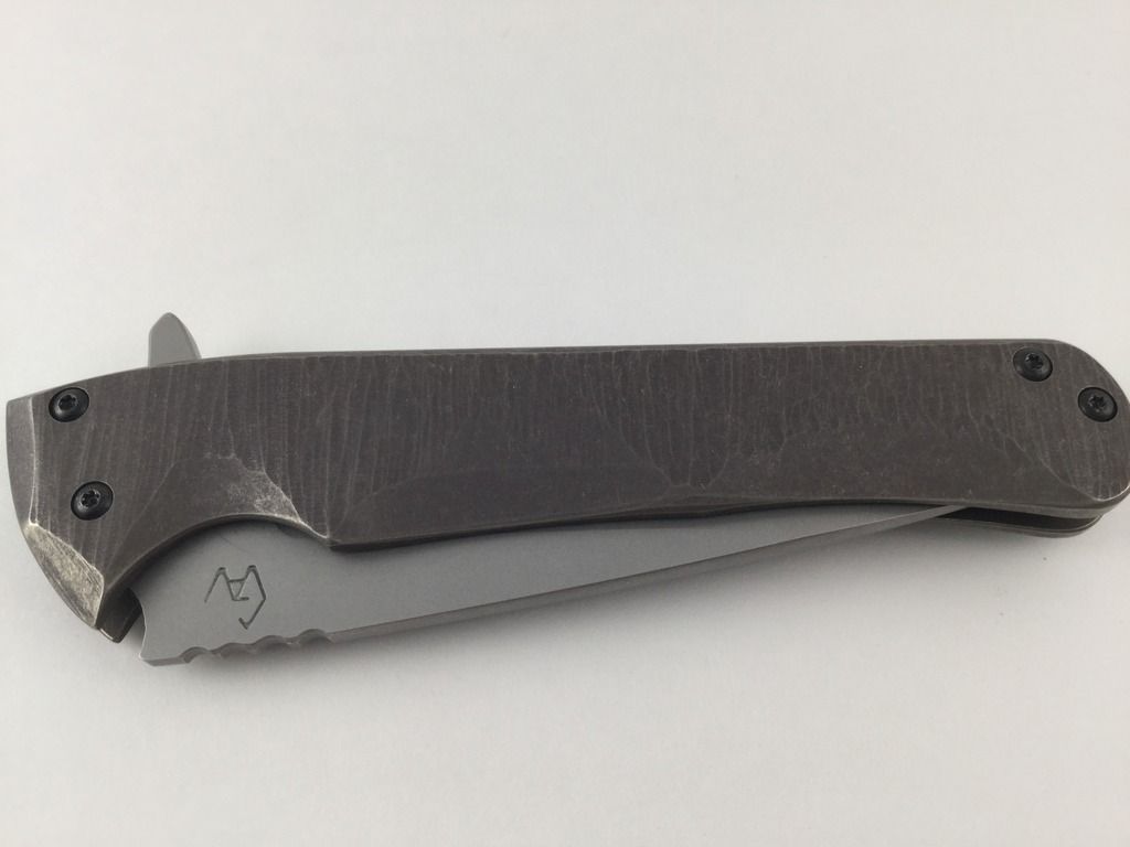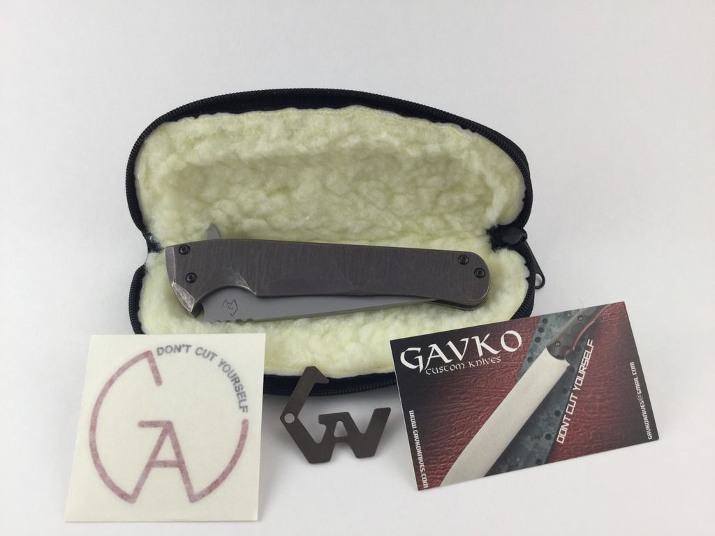 4. Gavko 2.0 flipper: This is an earlier model Gavko knife and is still extremely smooth. This knife was just sent back to Michal for a loose pivot and he put fresh Loctite in it. 4" Blade Length about 8 1/2" overall, super slim carry knife at about 1cm thickness throughout! Super sharp blade and no cosmetic issues at all with a tree bark finish.
