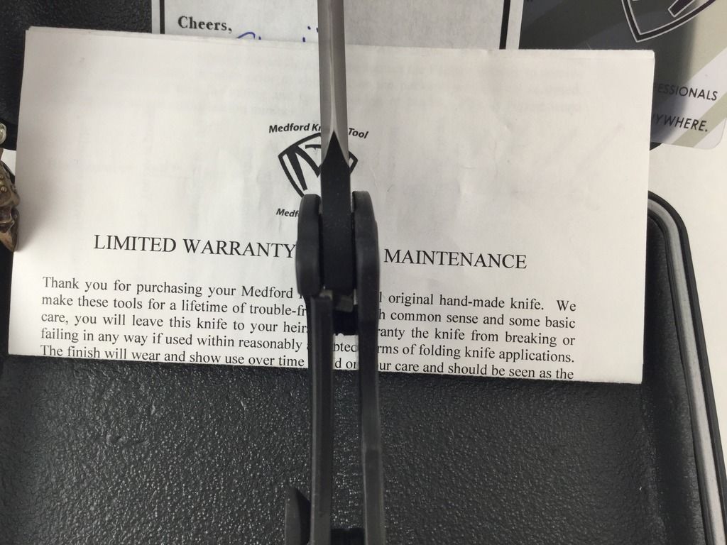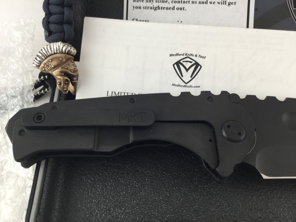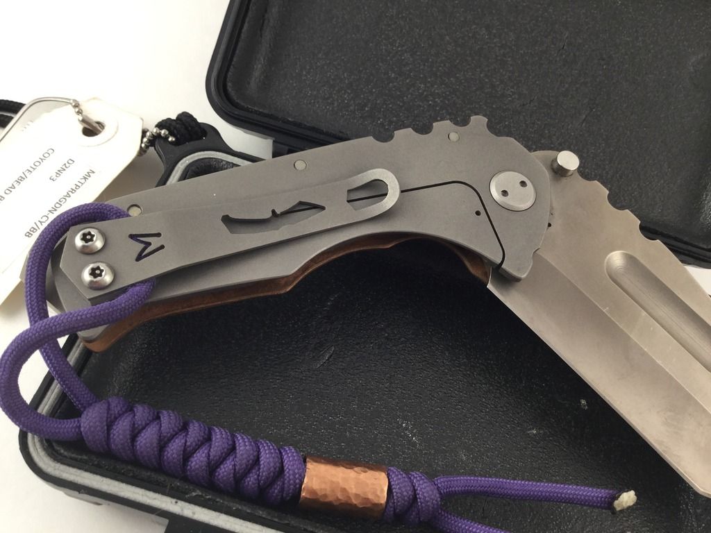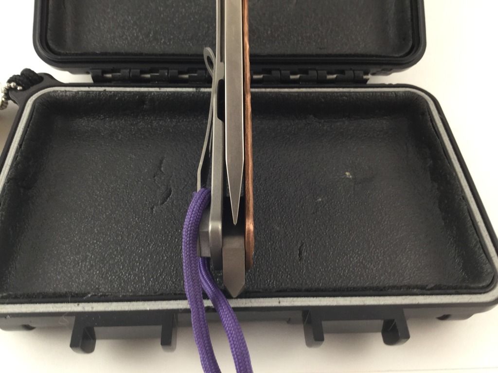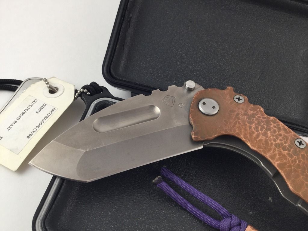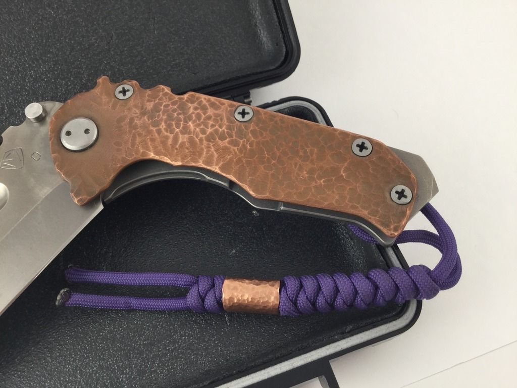 2. Second is a Praetorian G with a hammered copper scale made by Anthony Curio from Curio Knives! He is a partner of Quartermaster so rest assured the quality is top notch. As many of you know Greg's warranty is void, but I have spoken to Anthony and he will service the knife if need be though I am not sure on pricing. This one has been carried a few times, and there are some scratches on the blade as seen in pictures only a small snail trail on the clip. The lock-up is perfect and the action is smooth. This knife will include the matching hammered copper bead and lanyard, will not sell separately.