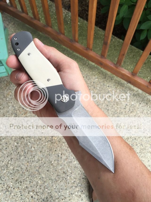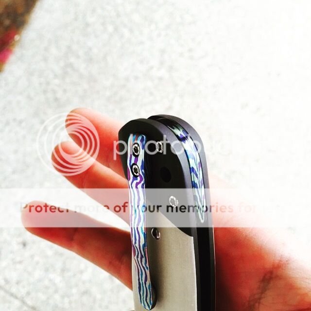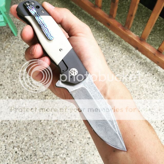 For sale is a beautiful Chad Nell Patton. Blade is 3.5 inches of CPM 154 in acid wash finish. Handle material is darkened titanium with white linen micarta. Backspacer and clip are zippered timascus.