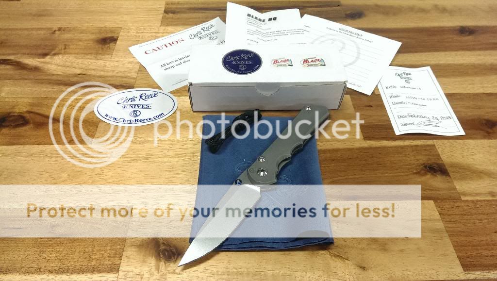 Bought this guy a few months ago from Blade HQ and have love carrying it fairly often since then. It has a small scuff at the top of the handle that is in the photographs, some of the normal snail trails on the titanium, and a small mark on the blade that is impossible to photograph as it only shows in rare light because of the stonewashed blade. All and all no major wear that could not be erased with a trip to Chris Reeve headquarters for a spa day. That being said this knife is super smooth, very sharp due to the 40 degree inclusive edge compliments of the Wicked Edge(only sharpened once), lockup is solid as a rock and hasnt moved at all(thanks to that ceramic detent ball) and comes with all the original paperwork, box, cloth, tools, birth card and sticker! I will miss this one alot but since I was promoted from the warehouse recently it just doesnt carry as well in dress slacks.