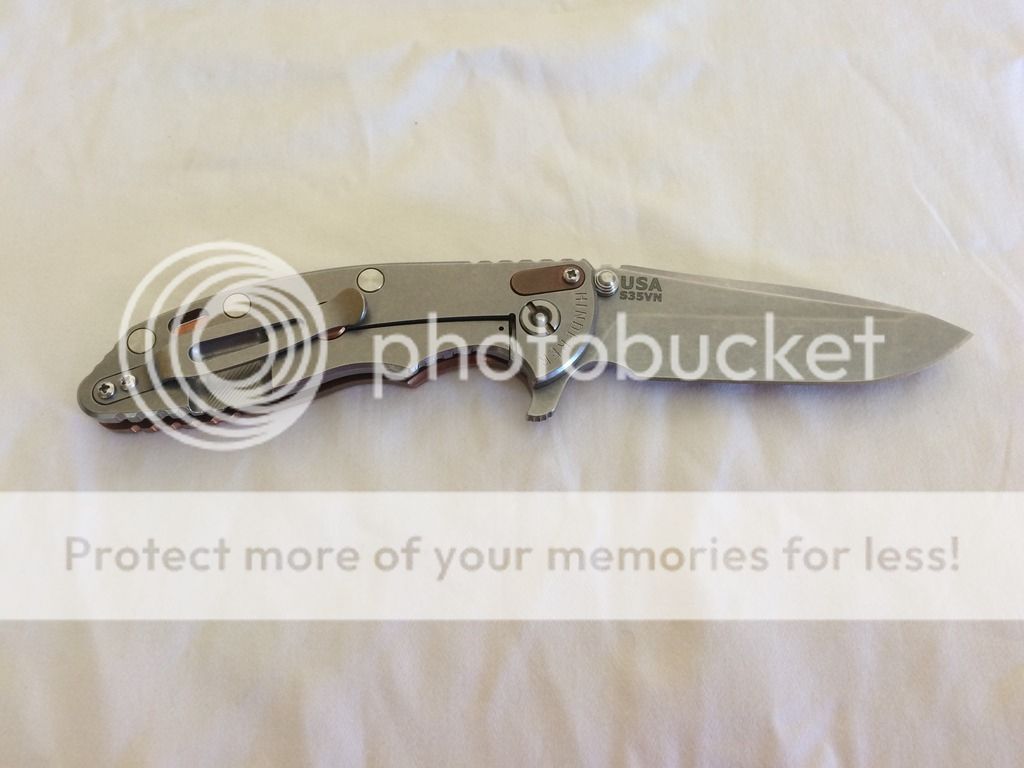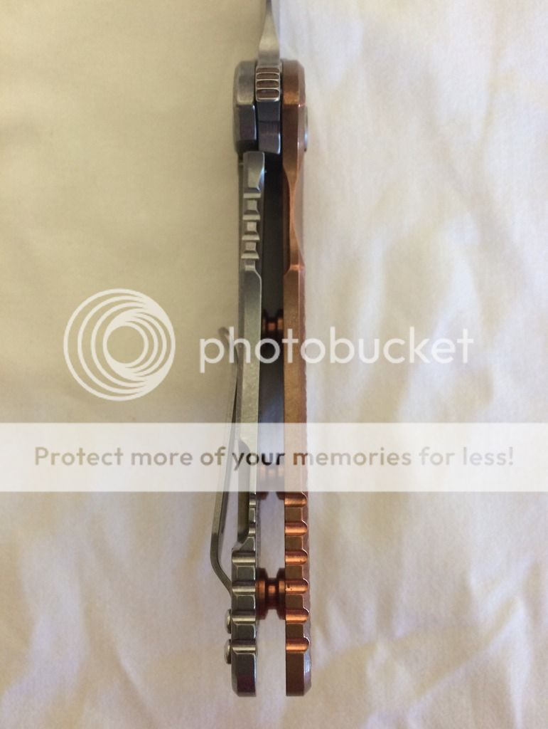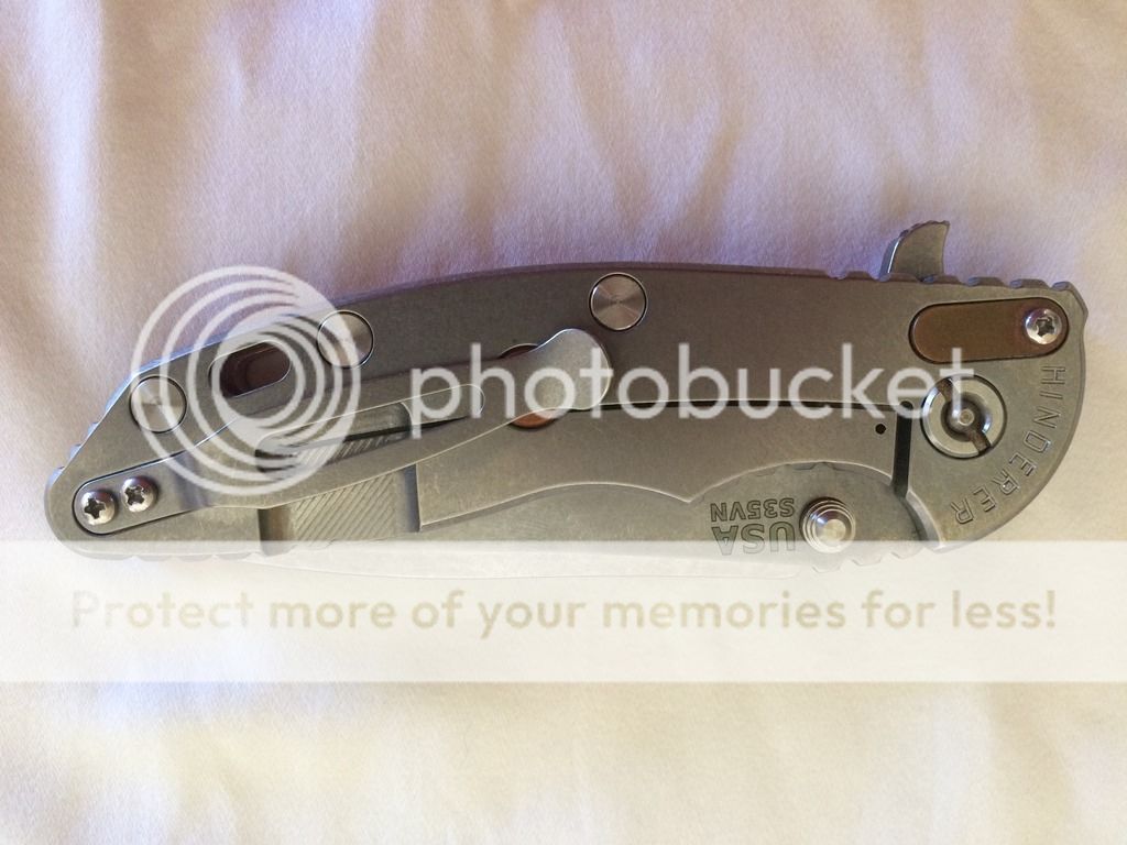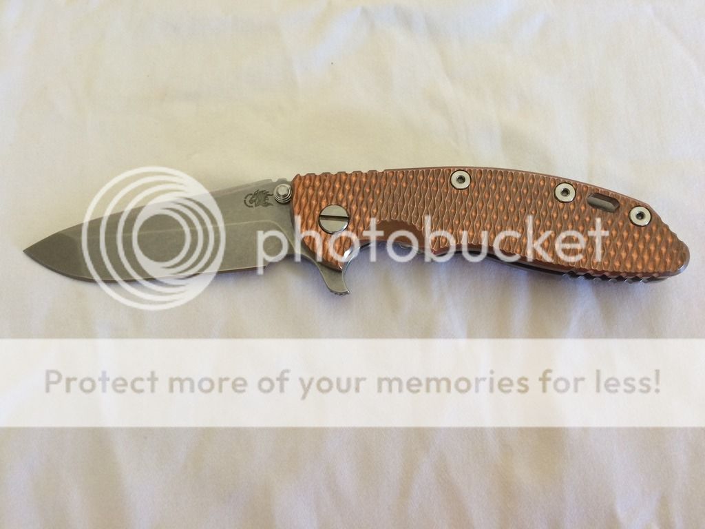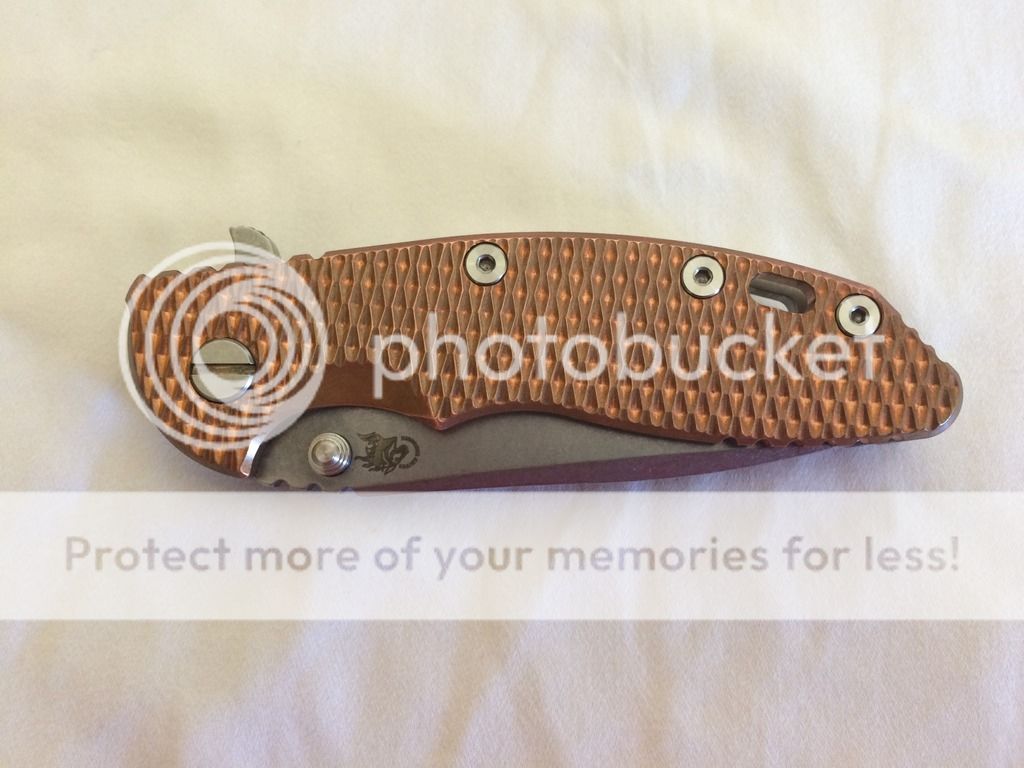 Hello, have a Hinderer 3.5 Spanto coppered out for sale. Knife has been carried for about a month. Cut open a few packages. I am original owner. Purchased from a retailer online coppered out. It came like it is as a dealer special. It came with copper scale, copper standoffs, copper lock bar stabilizer, and I added the clip filler tab. Knife has original edge and I can't find any carry marks other than a mark by clip, but I think it is from stone washing. Comes with box and stonewash clip filler tab. It does not come with liner scale or G-10 scale. I paid $600 new. It flips nice and smooth, perfect detent. Scale is starting to darken and get a nice patina.