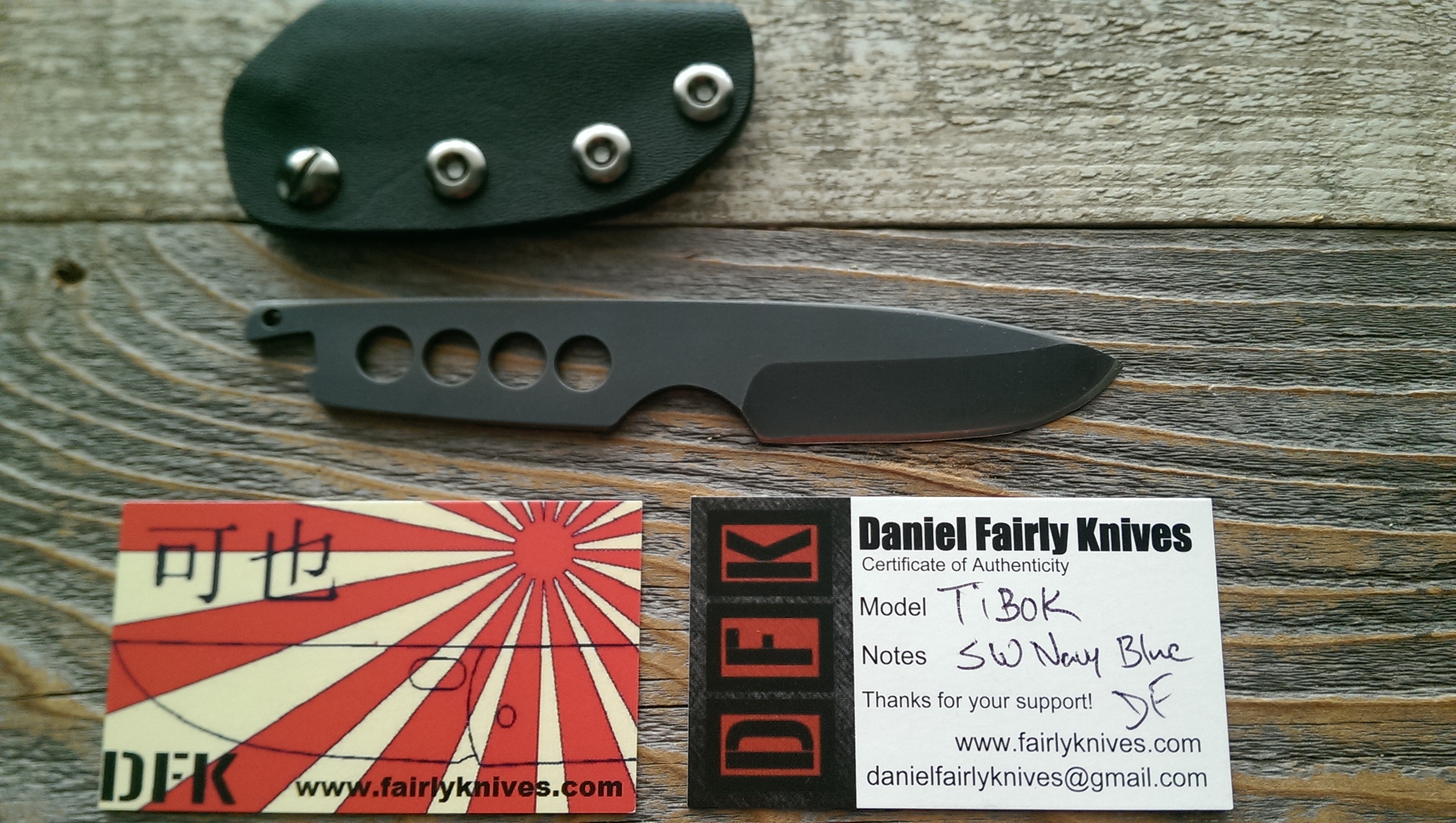 Daniel Fairly TIBOK w/cap opener Blue Anodized Titanium. Comes w/Kydek sheath and cards. Very light use cutting paper. $120 shipped. Now $100 shipped.