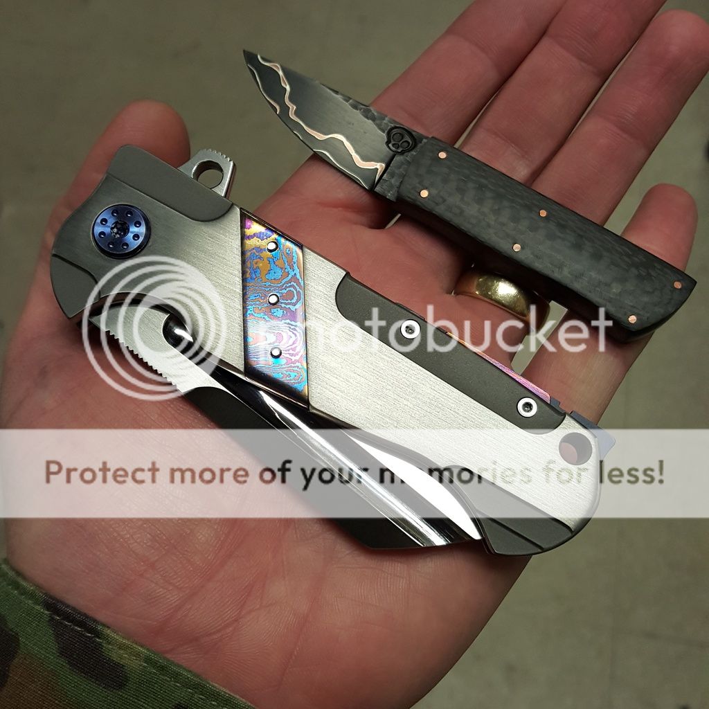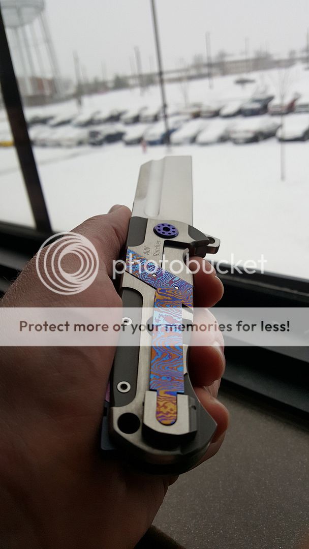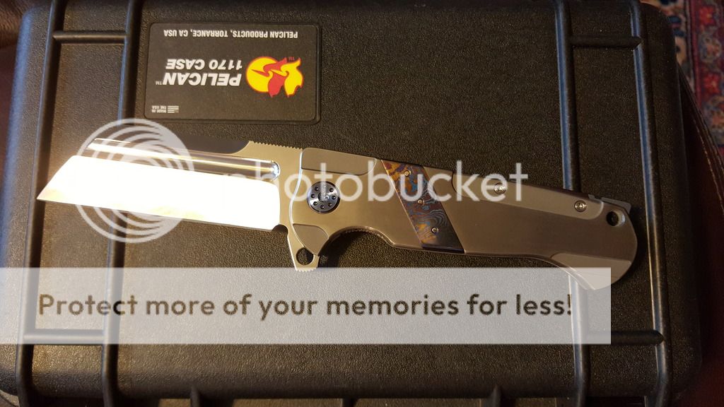 I am trying to sell my custom Andre De Villiers Butcher. It's a titanium frame-lock with mokuti inlays on both sides, a mokuti backspacer, and a mokuti clip. S35VN Wharncliffe blade. I am the original owner and I bought it from Knifecenter.com in October of this last year. It is in like new/mint condition and has not been carried much. Only reason I am selling it is to fund another knife and I'm not as big on mokuti as I though I would be. Comes with the original ADV digicam pouch.