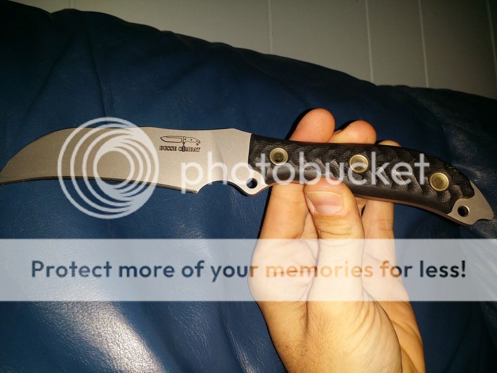 Got this about a week ago, it is used, has a 25° fresh edge on it, comes with kydex sheath. It has slight kydex scratches on the high relief areas of the spine, it feels great in the hand just isn't my style.