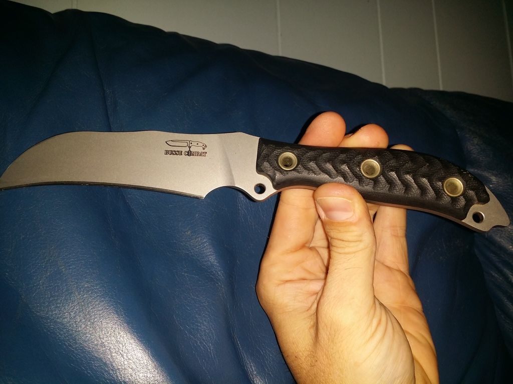 Got this about a week ago, it is used, has a 25° fresh edge on it, comes with kydex sheath. It has slight kydex scratches on the high relief areas of the spine, it feels great in the hand just isn't my style.