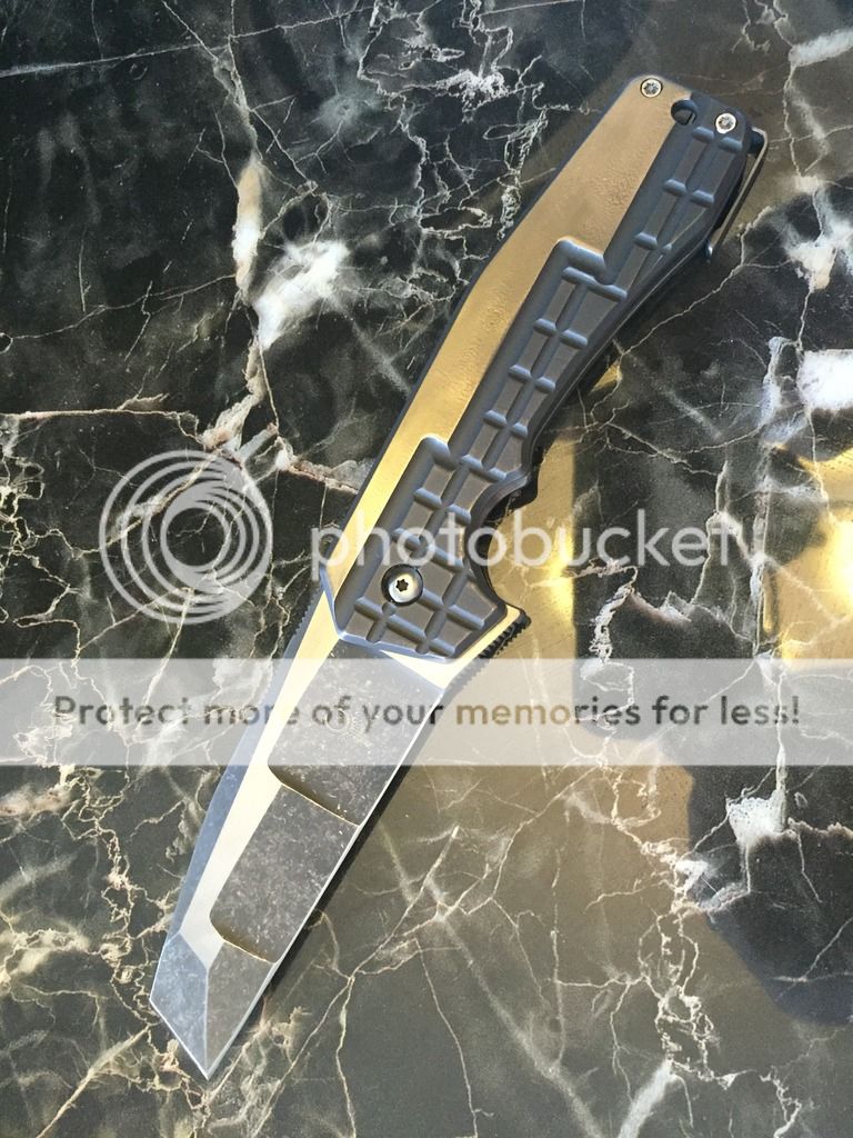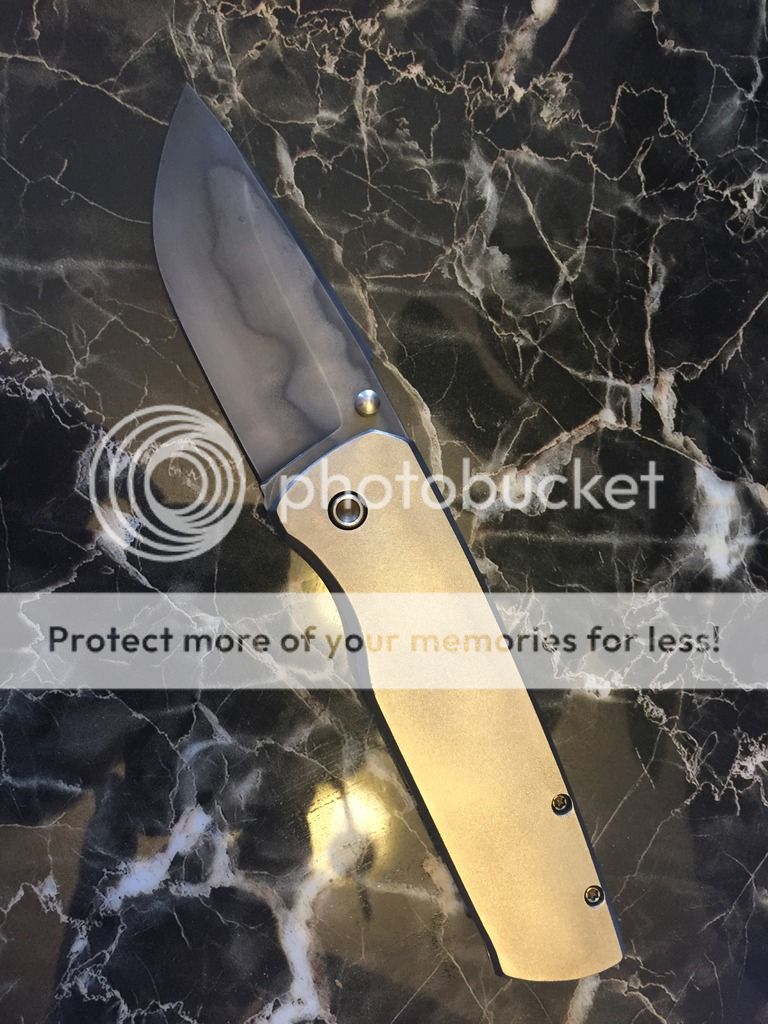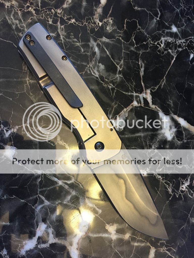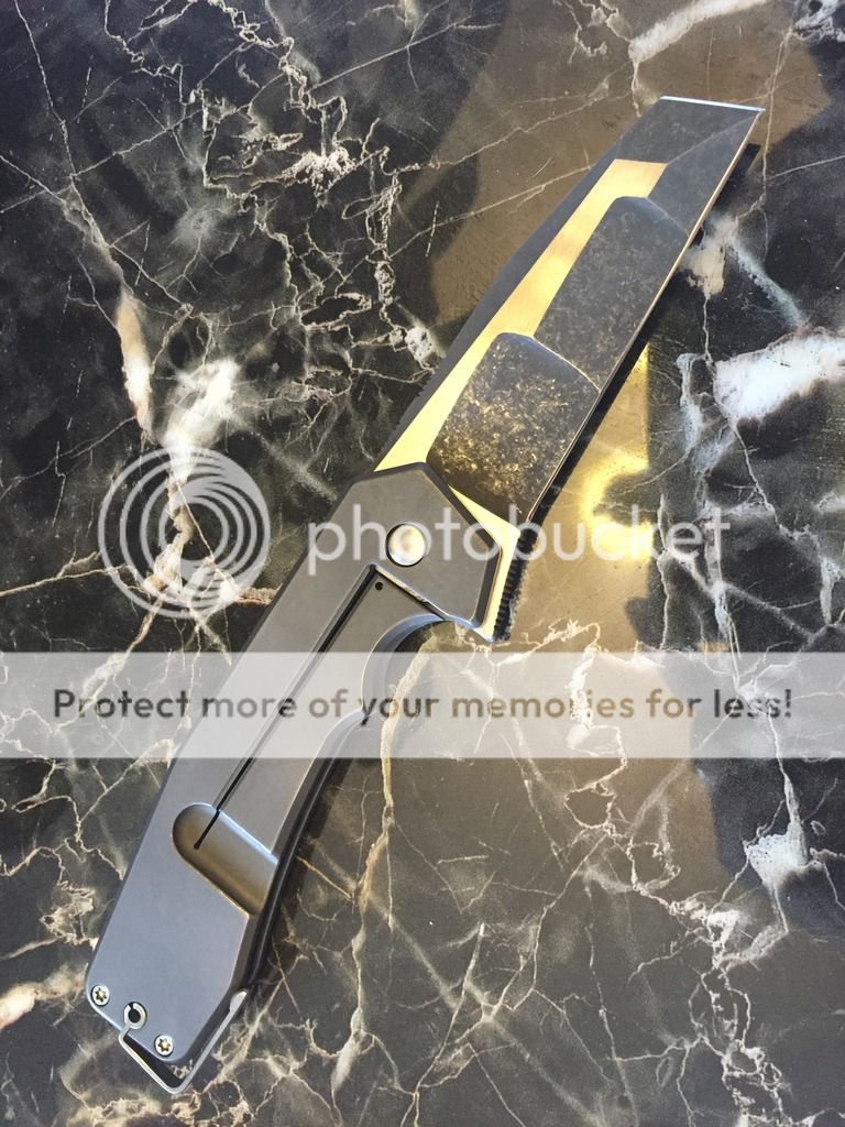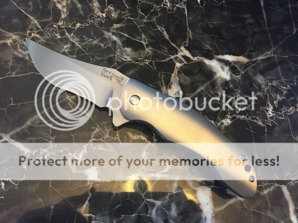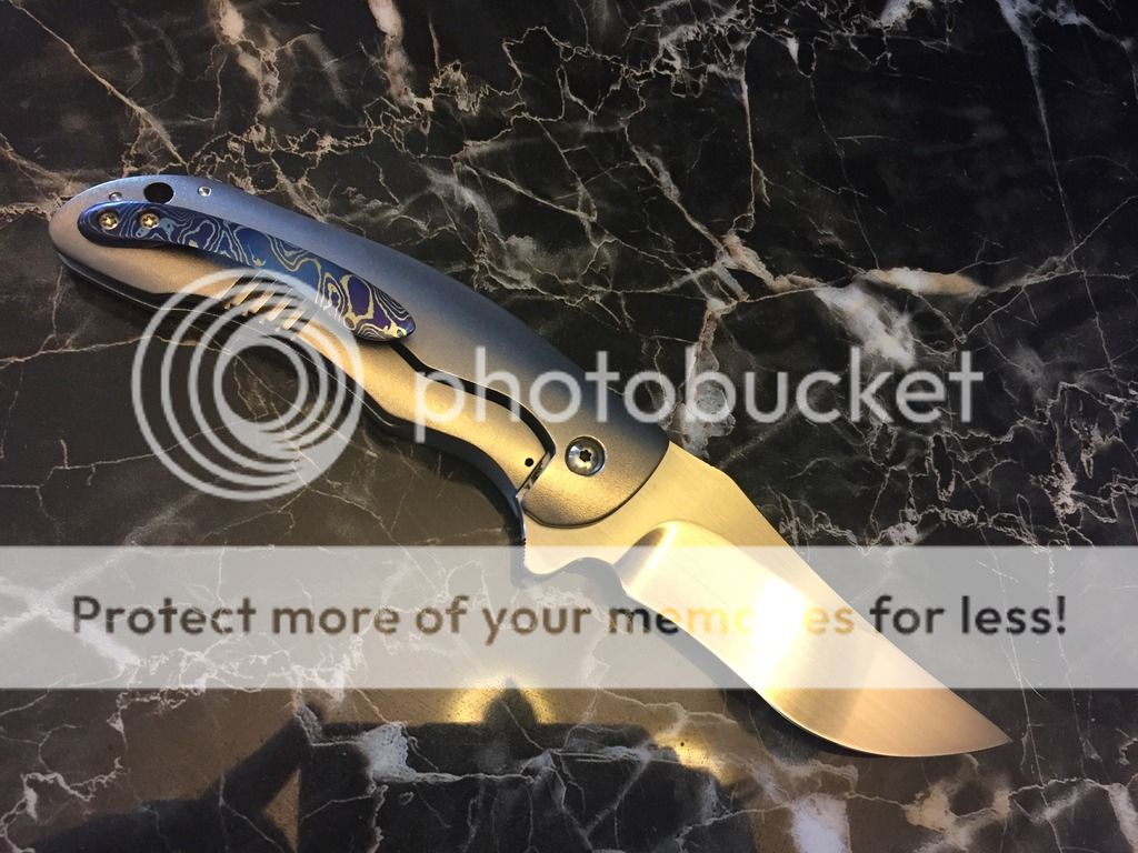 4) Tim Curry Myrmidon XL Folder. Orange peeled titanium handles with zirconium backspacer and pocket clip. Carried some but only used once on a box. Has some light scuffs on the blade. I am the second owner.
