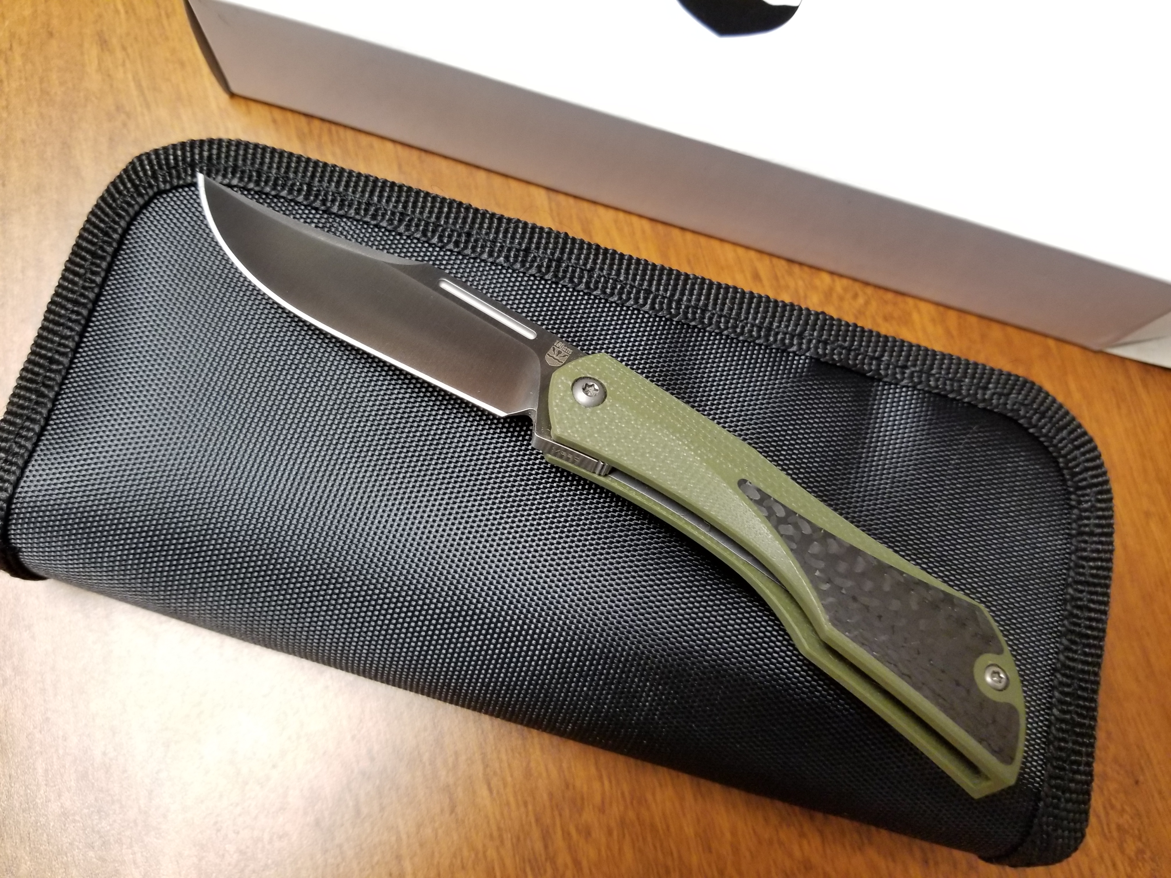 1 - Isham Bladworks [WE Knives manufactured] Black Star in OD green G10 w/ carbon fiber inserts and M390 blade. This knife has only been carried a handful of times and has only cut my finger, not even paper or an incoming knife package...as far as I can tell, it's as close to new condition as possible. Asking $130 shipped and Paypaled -- SOLD-- Thank you!