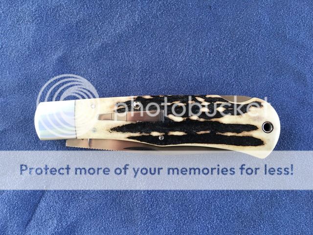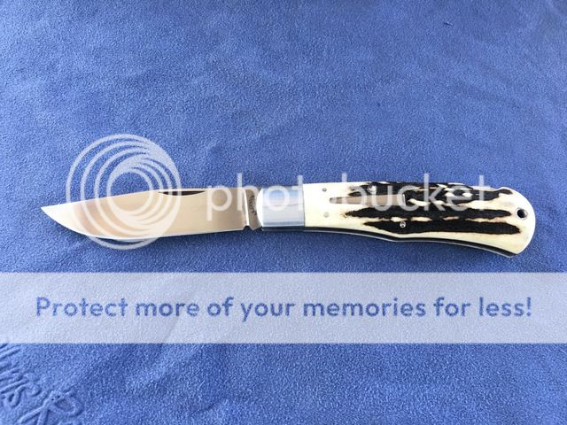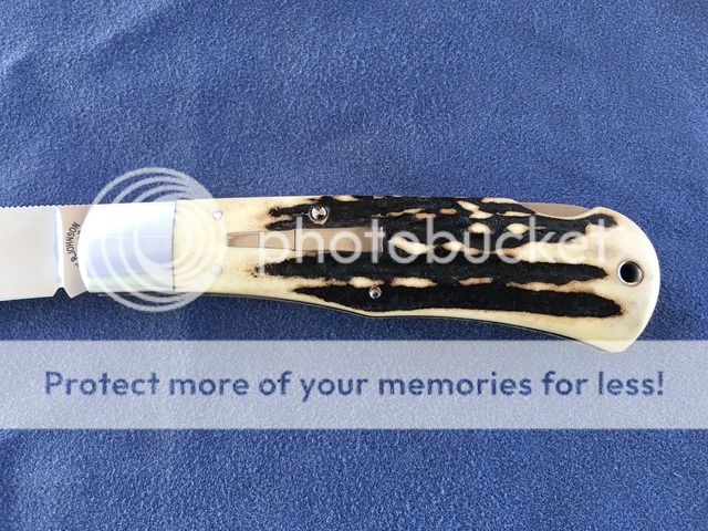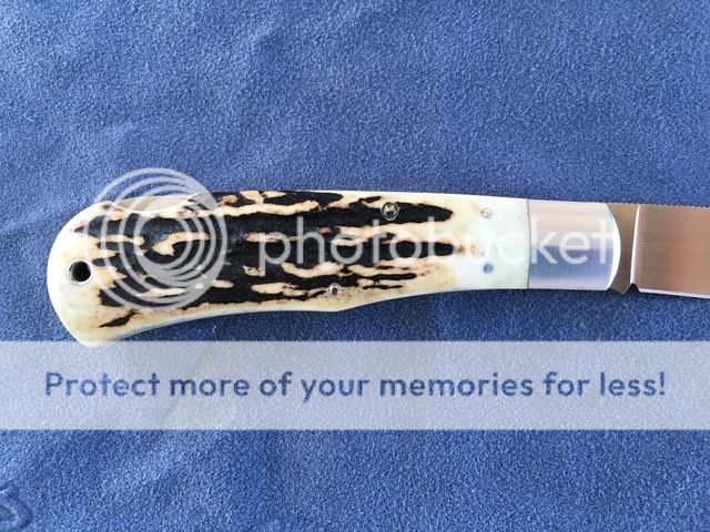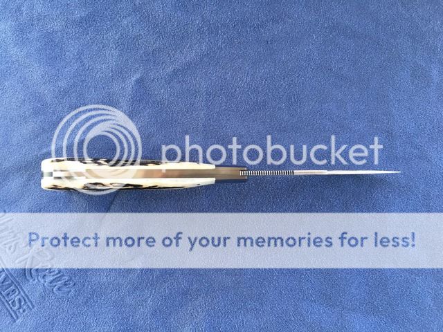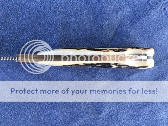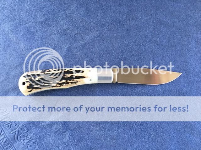 K.R. Johnson Remington 1306. Blade length is 3.5", overall length is 8". CTS-XHP blade steel with handrubbed satin finish. GORGEOUS sambar stag scales and bullet shield. Brushed satin bolsters. Pull is about a 5. Bought this one from a dealer who picked it up from Keith at the 2015 Badger Knife Club Knife Show in Wisconsin. Like new, never used or carried. Paid $1075. Asking $975 shipped.