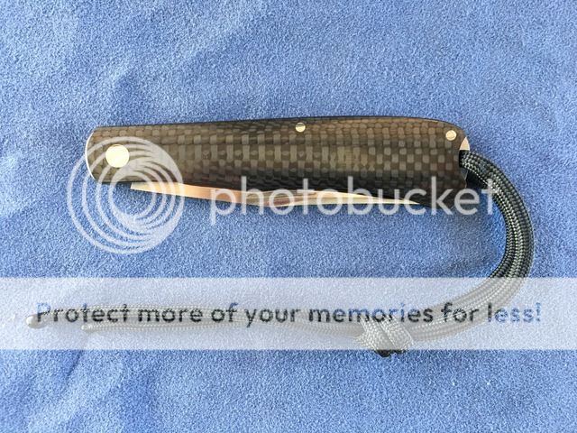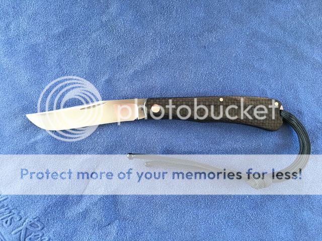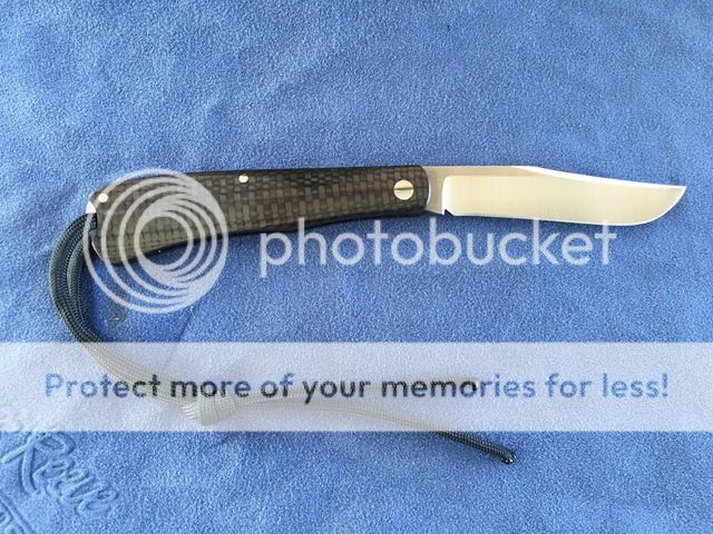 Bill Ruple Shadow Trapper. CPM154 blade steel with satin belt finish. Polished carbon fiber scales. No liners on this knife, very lightweight. Pull is about a 5, has a half stop. Bill's trademark filework on the spine. Like new, never used or carried. Direct from maker is $500. SOLD