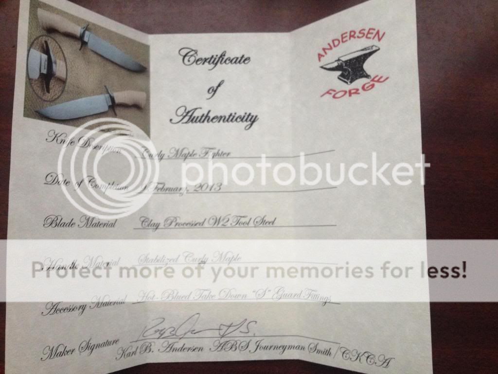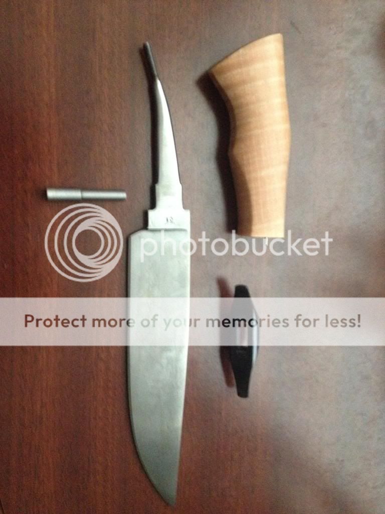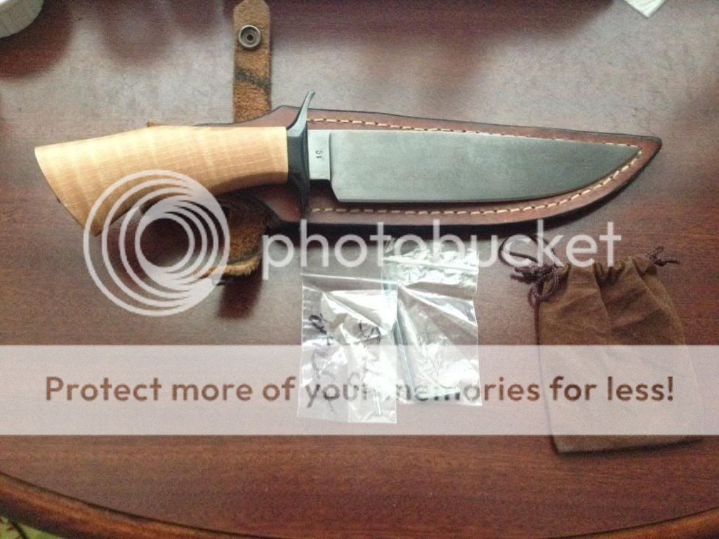 Hey guys, for trade I have a Karl Andersen Curly Maple fighter. W2 blade forged out and clay tempered, 1018 hot-blued guard, and stabilized curly maple handle. Aside from the threading and pommel bolt, every piece of this knife was done by hand and it is the only exactly like it. It has obviously been used, however this maker has quite a large wait time and his work is phenomenal. The blade has been gently used and never sharpened, though it has obviously aged a bit on the sheath with a patina forming on the blade and some minor damage on the handle. This knife comes with the original sheath, paperwork, and original pouch containing hex driver for disassembly, as well as spare roll-pins to keep lock-up tight. I would put the value at $575 shipped including PP fees, though I am somewhat flexible. I will be shipping this one out USPS Priority 2-Day, and would like the same for any received knife if trading. CONUS only please. Thanks!