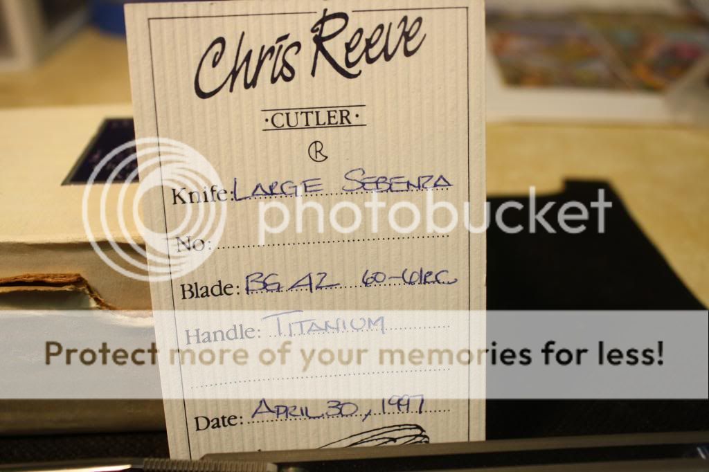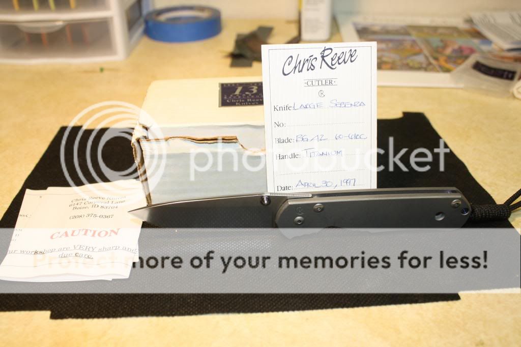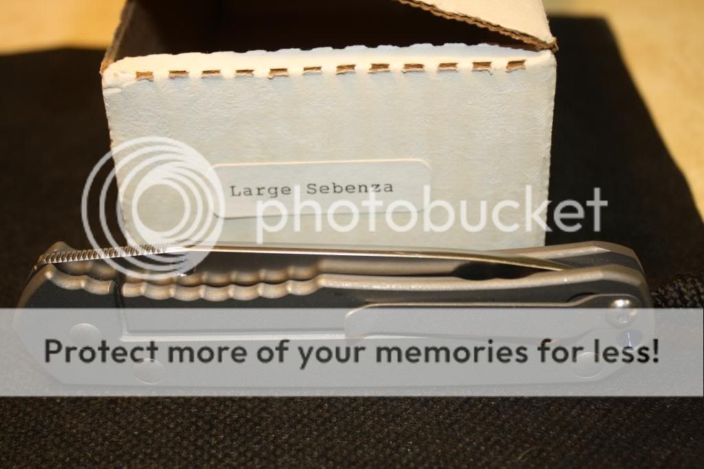 I am going to make this short so I do not back out. I am only selling because the right rifle has become available. As the title says I have a large Regular sebenza with BG-42 blade for sale. Birth date is April 30, 1997. It comes with original box, all paper work and tool. It has been my EDC so it is not collector perfect. It has snail trails and has been sharpened on the wicked edge. It with was used but never abused. I would send it to CRK's for a spa but time does not allow. If you have any questions please ask them by PM NOT in the thread. I am asking $Sold or best offer (please be real in your offer). The first "I'll take it" IN THE THREAD NOT PM will get it. Prompt payment is expected. I will take PP gift or add 4%. I will cover ins. and shipping. I will let the pictures do the talking. Thank for looking.
