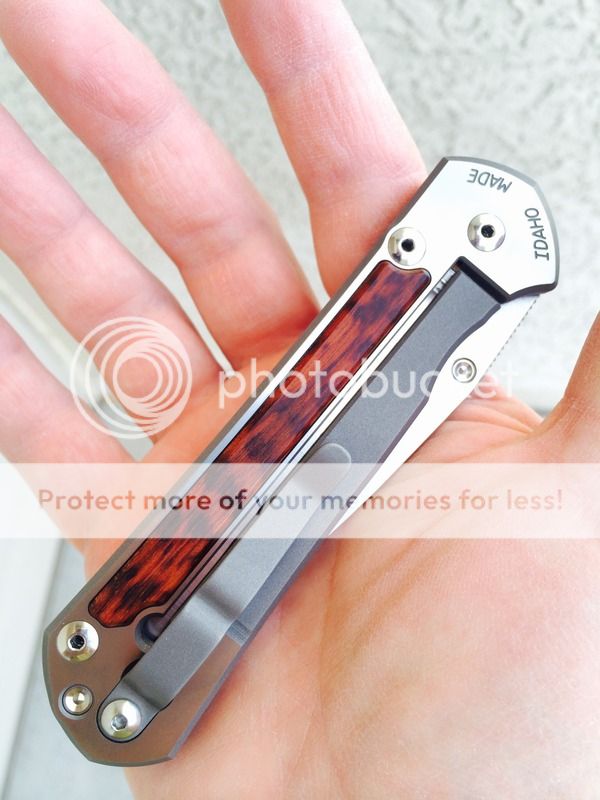 It has a very sharp, untouched factory edge. I did remove the lanyard (pin still installed and lanyard is in box) and there are a couple of very minor marks on the Ti from the few times I have carried it (couldn't get them to show on camera). If you follow me on IG or YT you've seen this knife before. The snakewood inlays are superbly matched to each other and have very vibrant colors and contrasts. Comes with the box and all its proper contents, include the leather CRK slip (unused).
