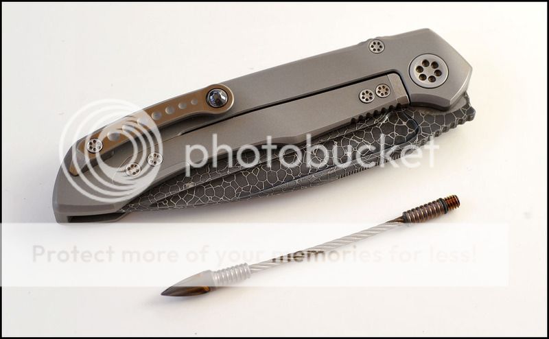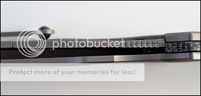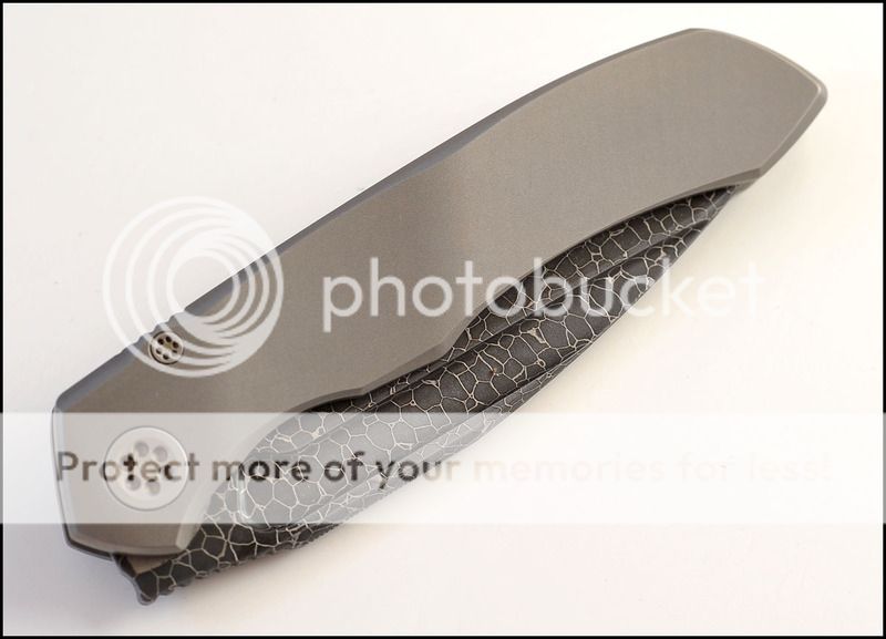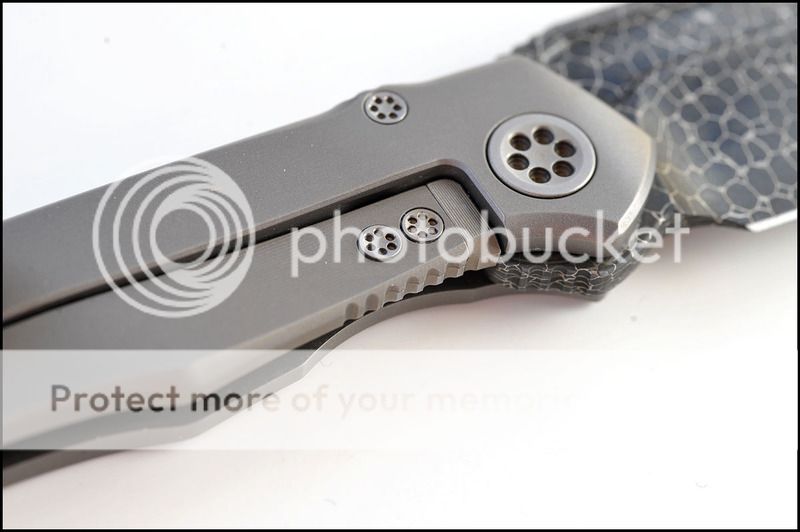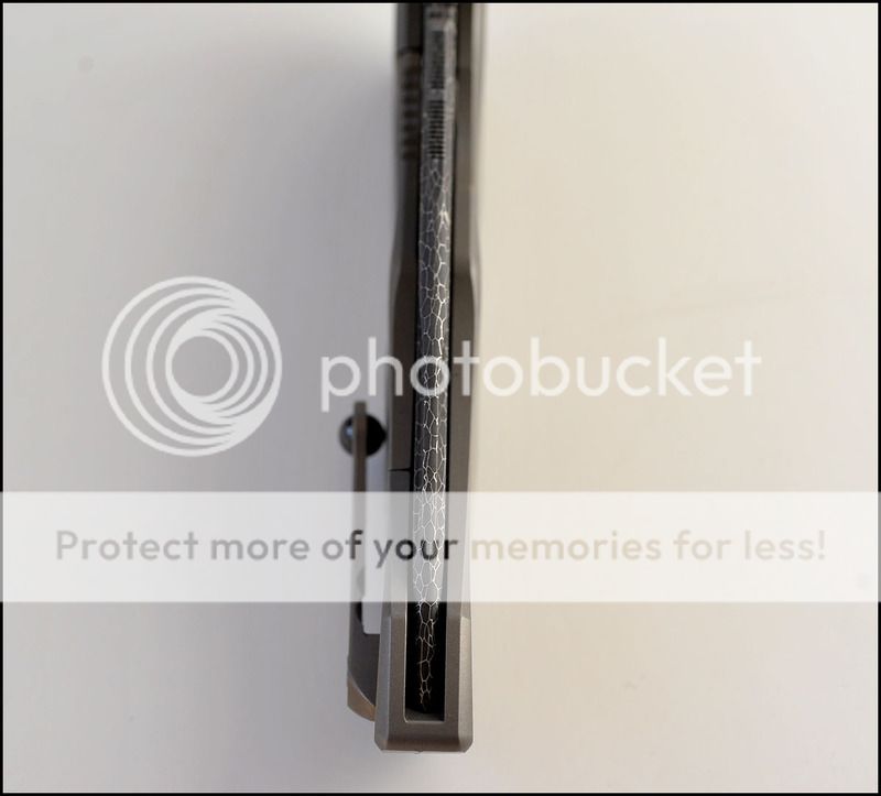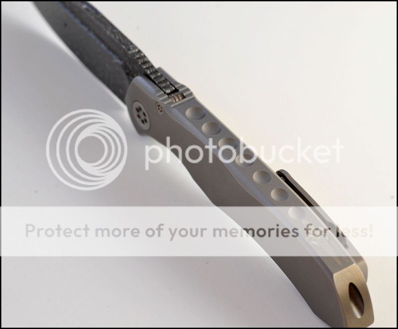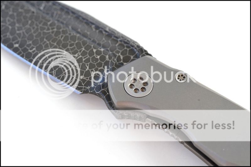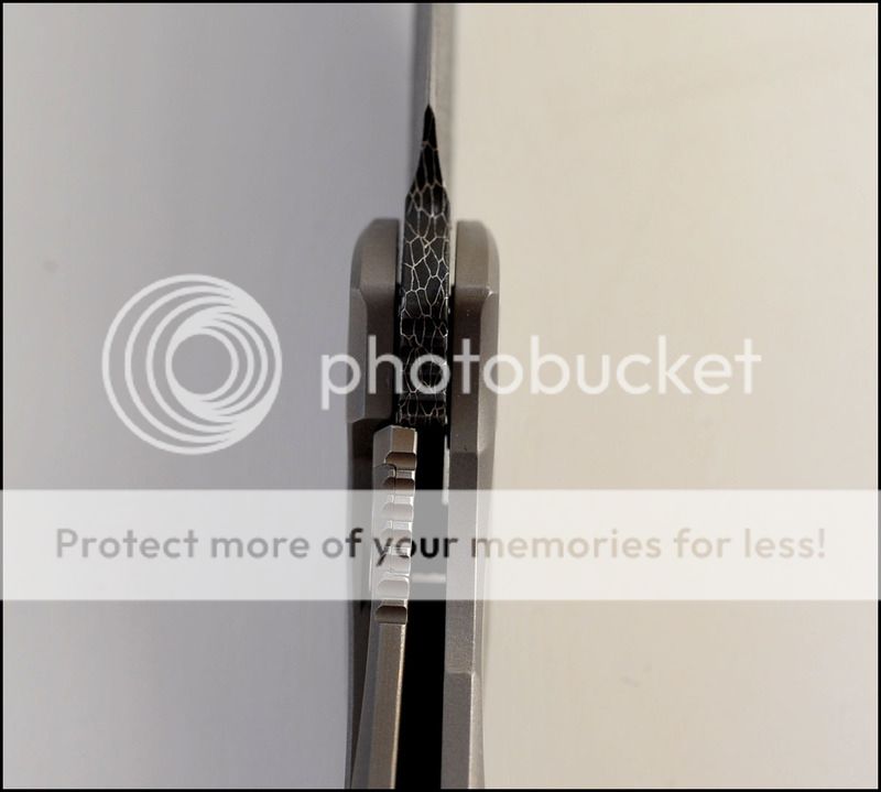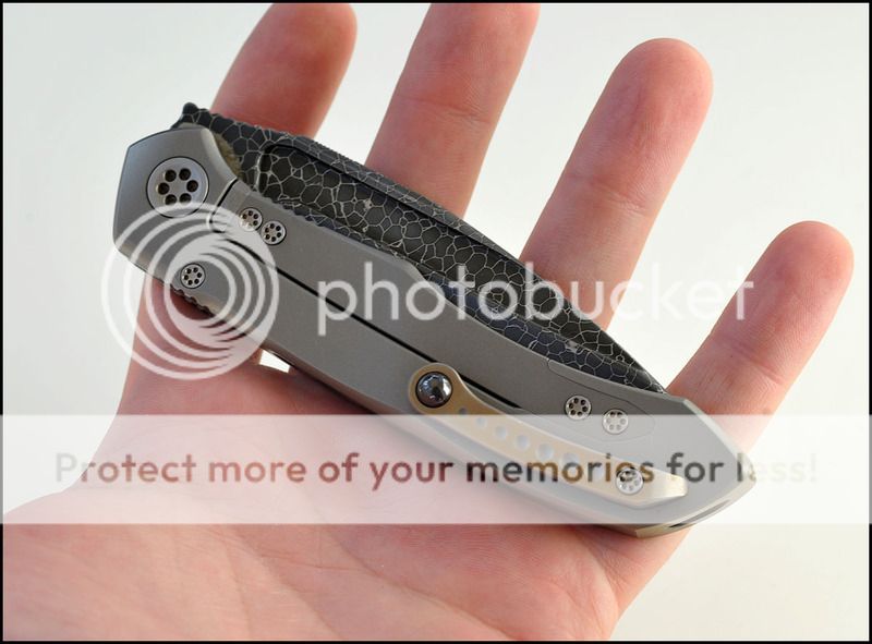 This is a bit of a catch and release for me. The build quality and fit and finish are absolutely impeccable but I just can't seem to fall in love with this one. The knife includes the original box, velcro Ti dagger, dagger zipper pull, zippered pouch and the "lanyard". Overall the it is in 100% as new condition. It has not been carried or used to cut anything. I have flicked it quite a few times but other than that the knife hasn't seen any real use. The blade is perfectly centered, there is zero rock in any direction and lockup is about 40% and solid. The Ball Bearing Damascus has a real dark, striking look in person. Very cool looking blade. I tried to photograph the serial number inside the frame, see below.