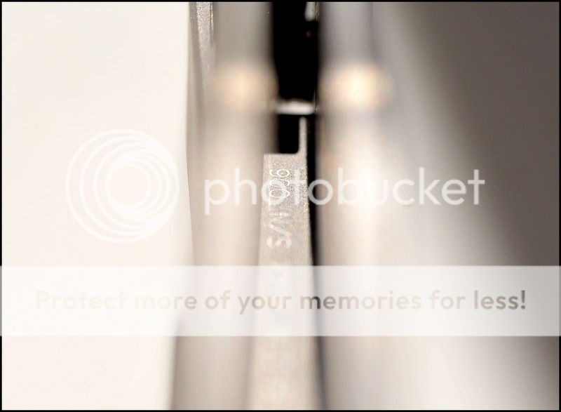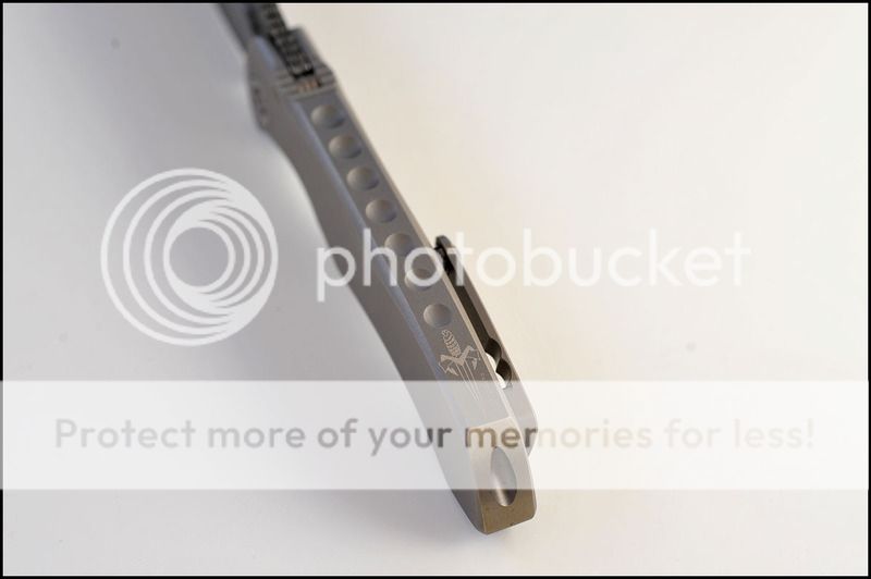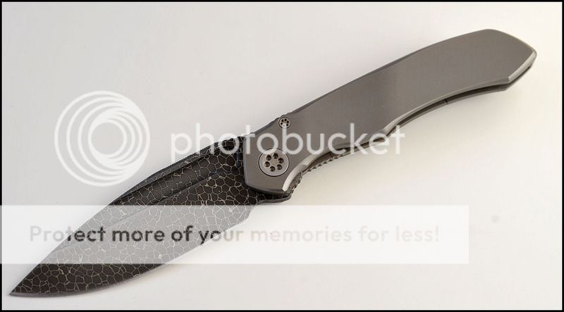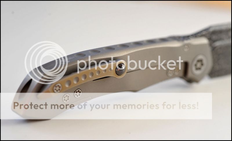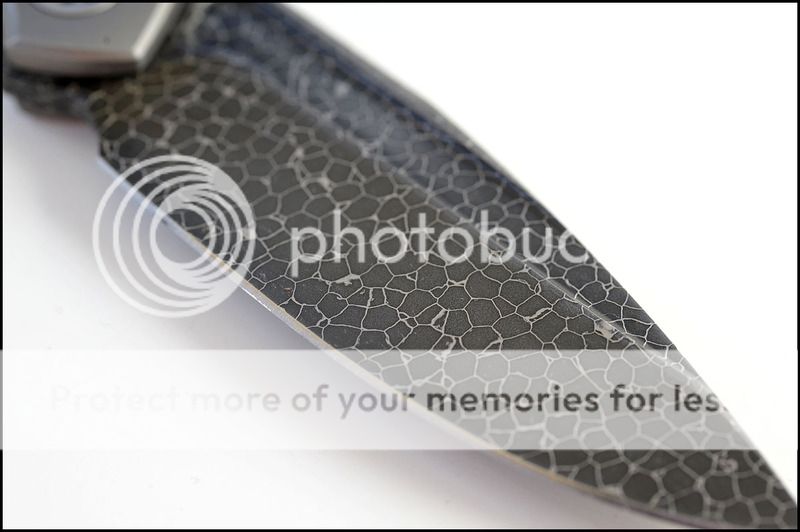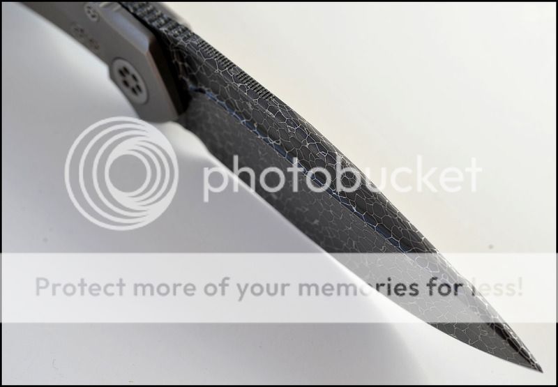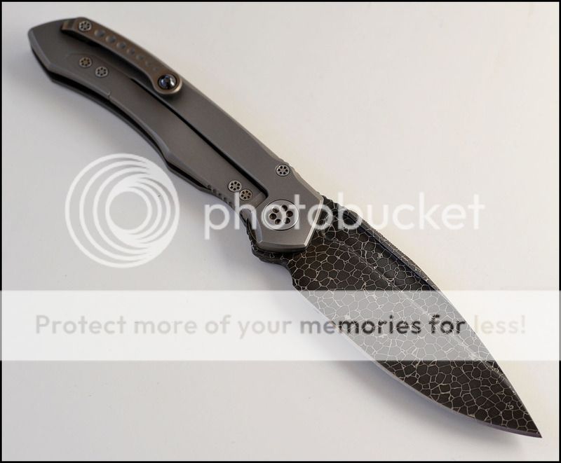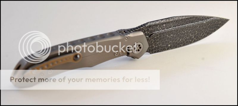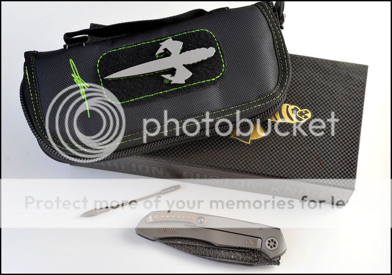 This is a bit of a catch and release for me. The build quality and fit and finish are absolutely impeccable but I just can't seem to fall in love with this one. The knife includes the original box, velcro Ti dagger, dagger zipper pull, zippered pouch and the "lanyard". Overall the it is in 100% as new condition. It has not been carried or used to cut anything. I have flicked it quite a few times but other than that the knife hasn't seen any real use. The blade is perfectly centered, there is zero rock in any direction and lockup is about 40% and solid. The Ball Bearing Damascus has a real dark, striking look in person. Very cool looking blade. I tried to photograph the serial number inside the frame, see below.