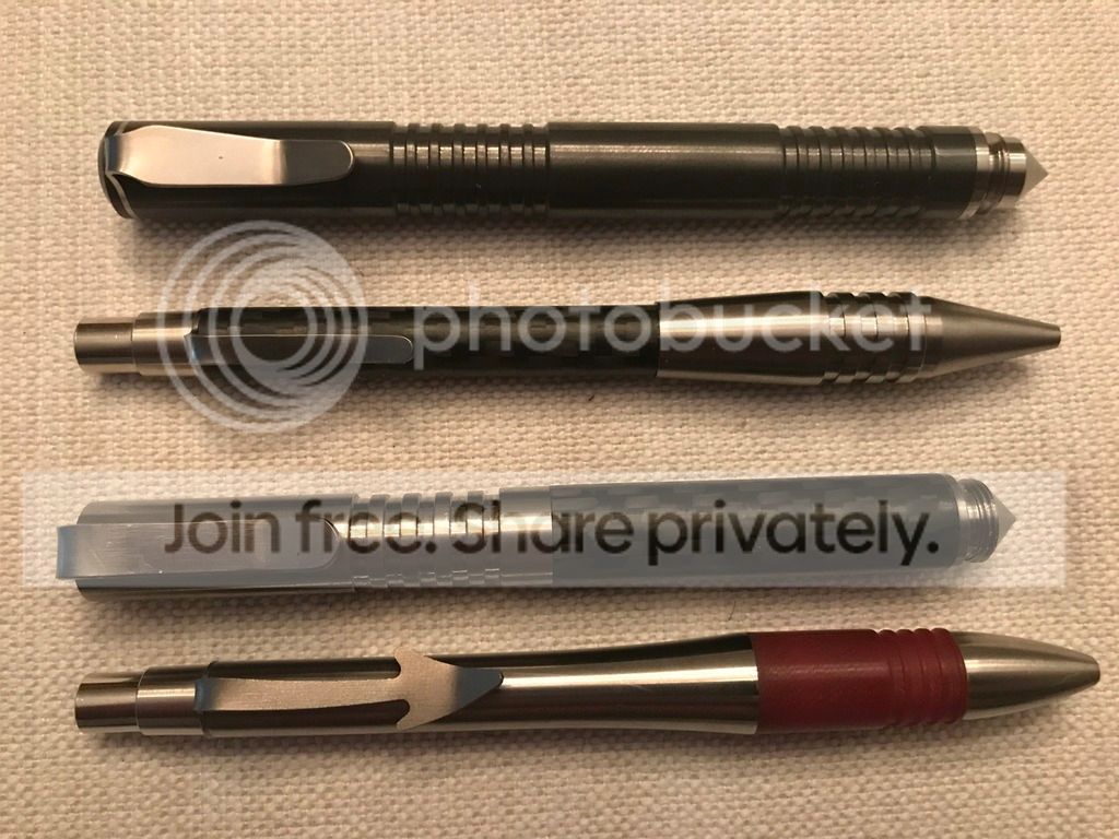 mag1 Feedback: +110 / =0 / -0 Joined Sep 26, 2010 Messages 1,769 Sep 4, 2018 #1 1.Tactical Zirconium 500..$190sold 2.Tactical click pen titanium/CF..$95SOLD 3.Tactical titanium/CF..$150 4. Devilstator click pen titanium/G10...$sold Pens were never used and are in tube cases. prices shipped conus and paypal Last edited: Oct 11, 2018
