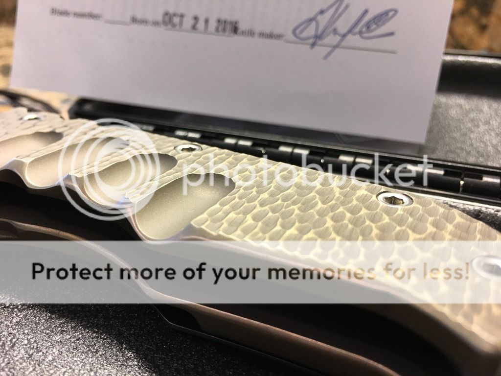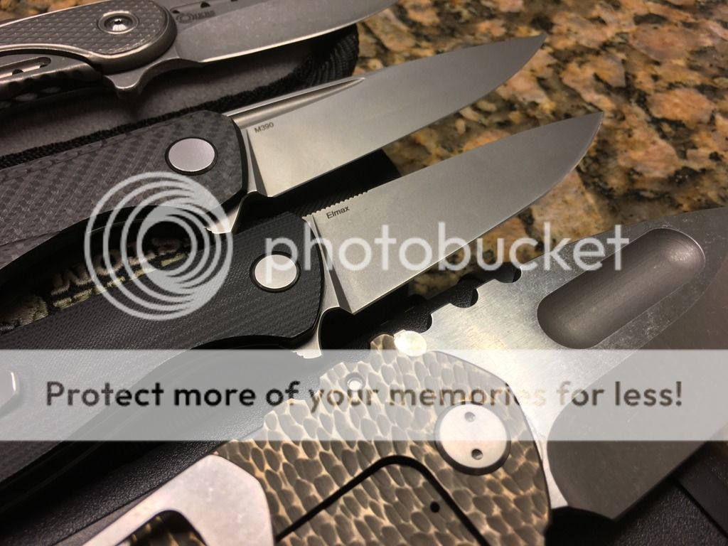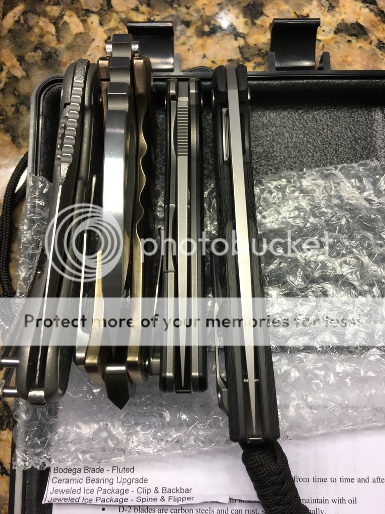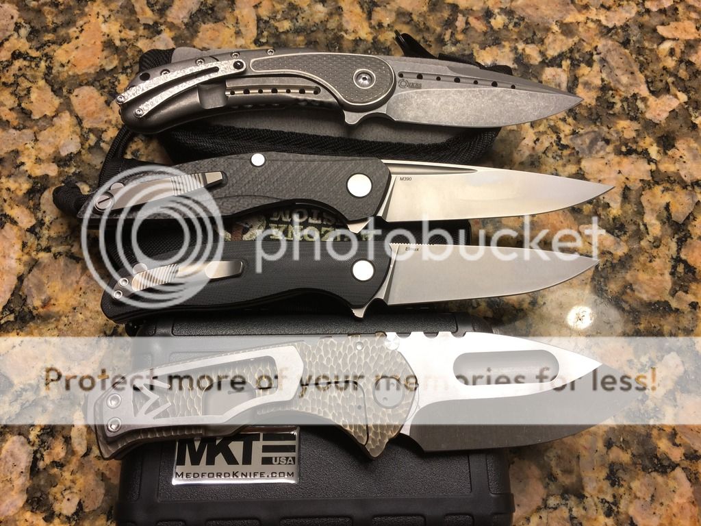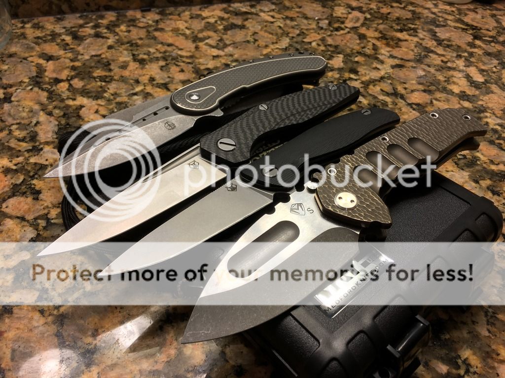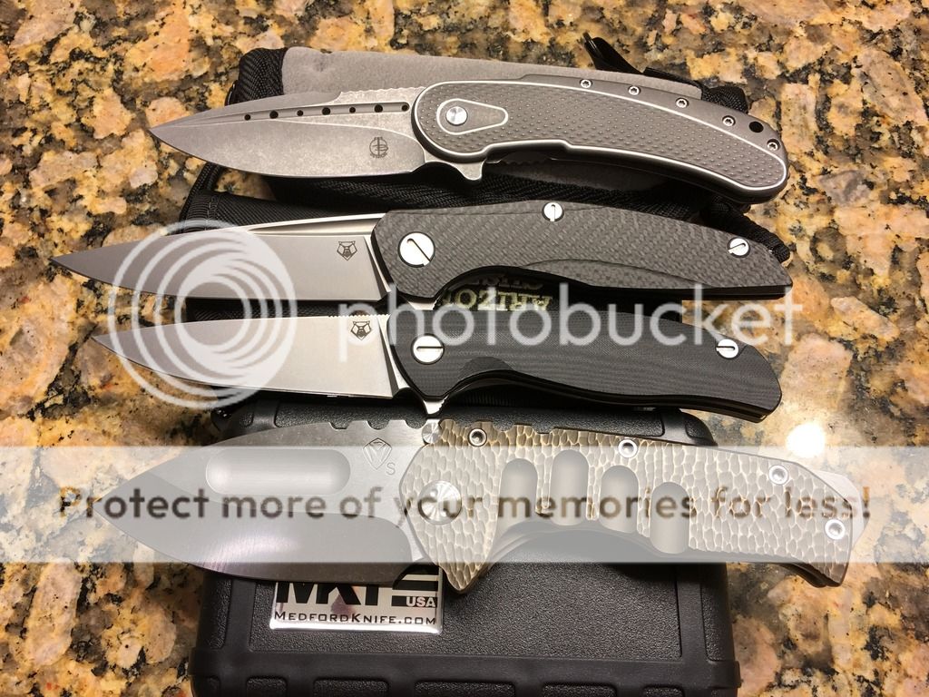 A couple of unique combinations are up for sale. The Medford has a unique sculpted titanium handle that has a slight resemblance to small dragon scales I find intriguing with a upgraded S35VN steel . The blades of the Medford and Shirogorov 111 haven't cut anything. The Shirogorov F3 has been stropped to a keen edge and has a small carry mark on the G10 near the clip. All knives are in great functioning order. This is a great Medford Ti that allows you to bypass the 18 month waitlist! If you require additional photos, please don't hesitate to ask.