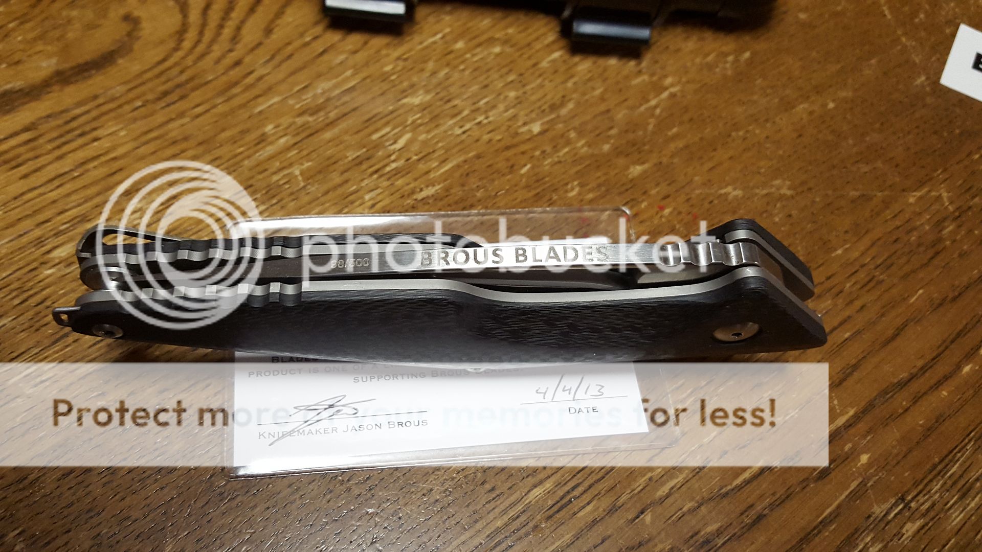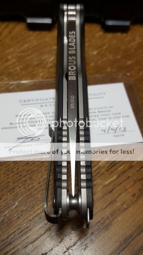But It is Incredibly Light with Titanium Liners and Full Carbon Fiber Scales!!! Blade Is Dead Center, Locks Up Tight, Flips Smooth and Super Quick....Awesome....However... In the Spirit of Full Disclosure... It has a small knick in the blade where The Blade somehow contacted the center Barrel Spacer. Its not touching....Clearance is fine. With being said: This knife has A LIFETIME Of Sharpening and Refurbishing for FREE From Brous with the Included COA. Now....The good Part.....Priced to Steal at Only $299.00 usd (Net To Me) OBO with FREE Priority Shipping. Feel Free to Email with any questions. My Name is Andy; and my Email is andyaltman@live.com