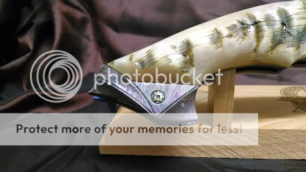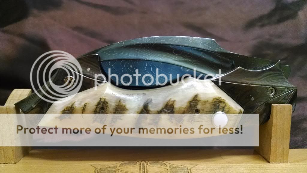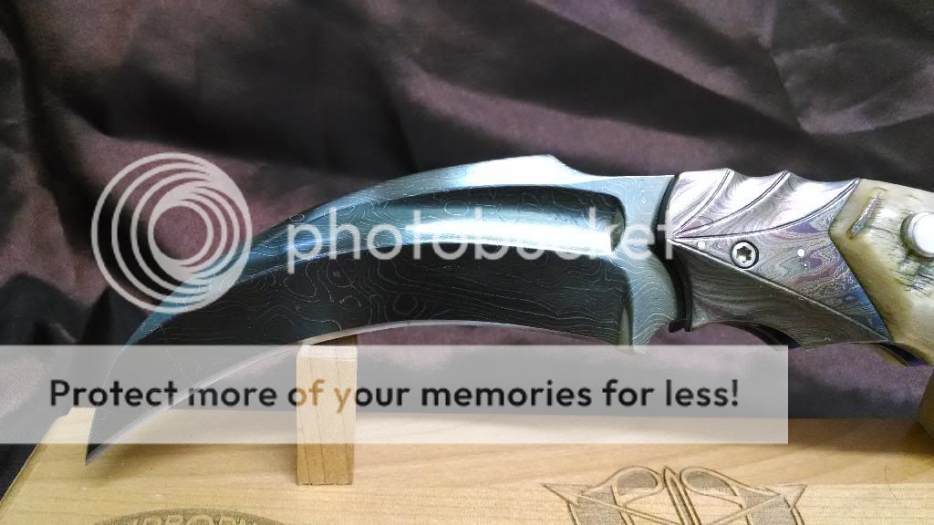 Offering for sale; Another gorgeous and Large Auto piece from Reese Weiland!!! Blued Damascus hawkbill blade and double bolsters with sheephorn scales. Jeweled anodized titanium liners. Vine filework on Stainless Steel Backspacer. The blade has a small nick in the blade edge and a few light scratches through out, otherwise......Perfect!!!!!! Blade Length: 4.5" Overall Length 10.875" Weight: 14.6 oz Feel free to Pm me if you have any questions. Price is 1395.00 usd Net To Me. OBO. Payment to be made via Paypal or Postal Money Order. Free Shipping anywhere in the world!!!!!!