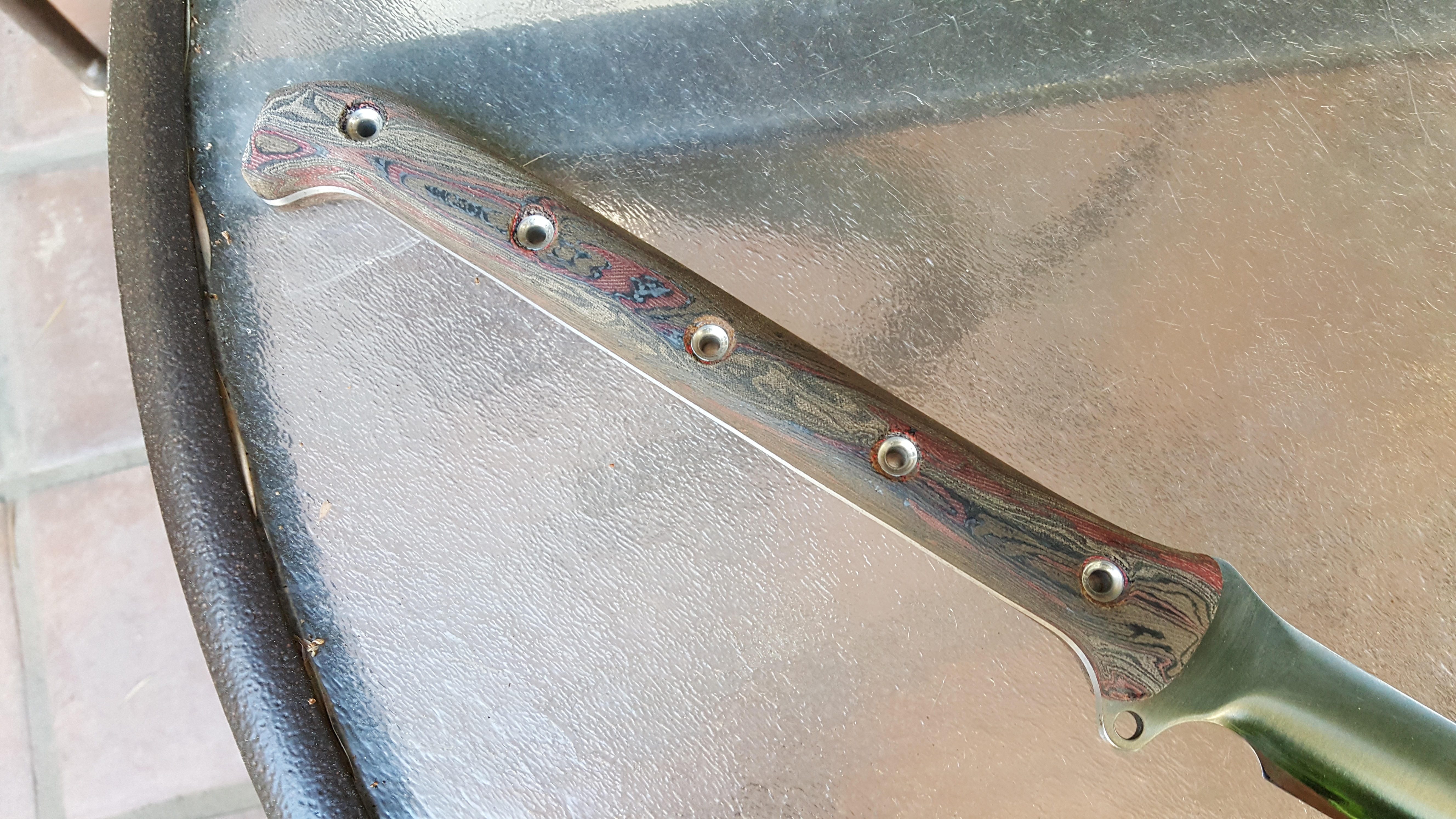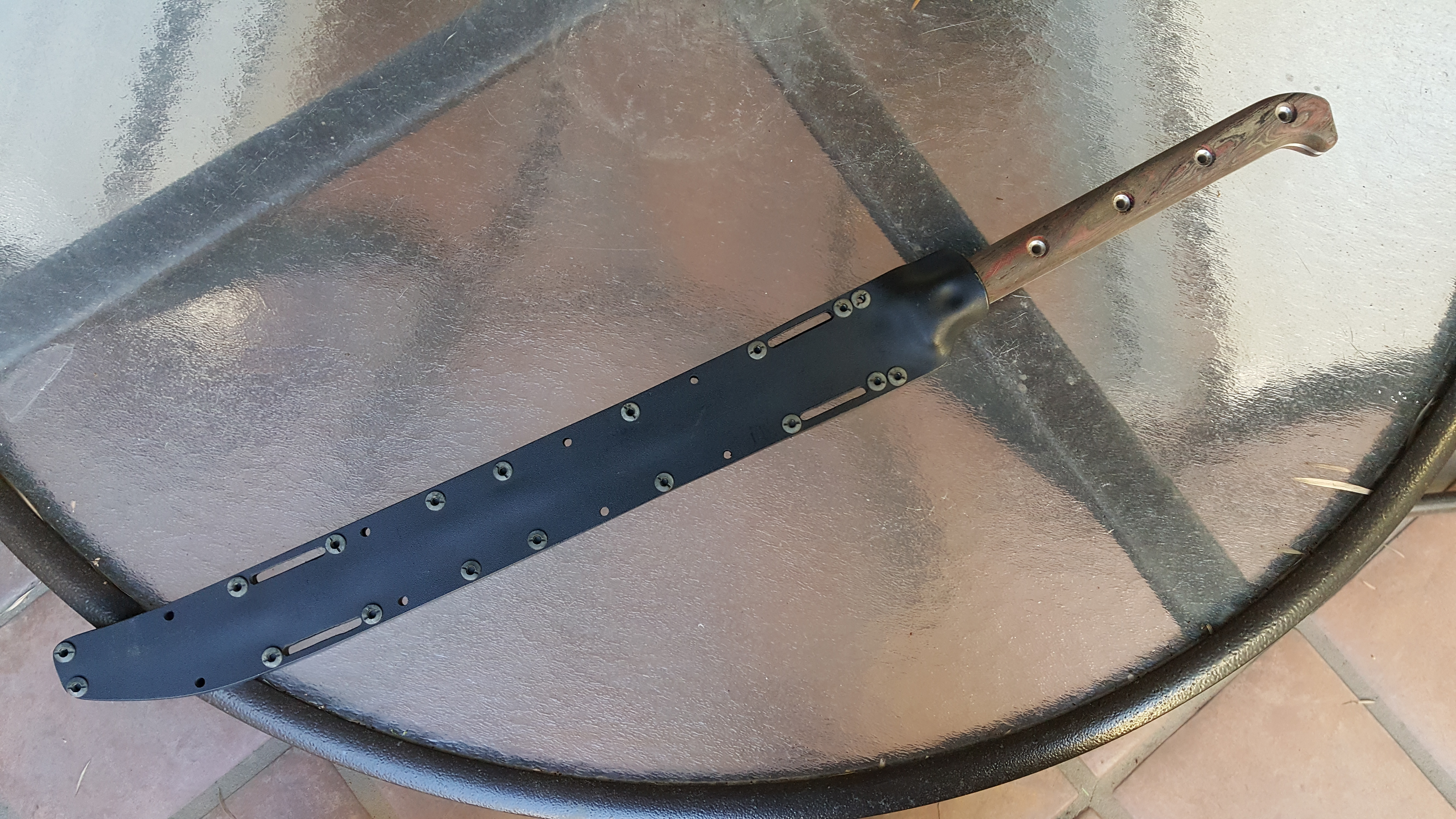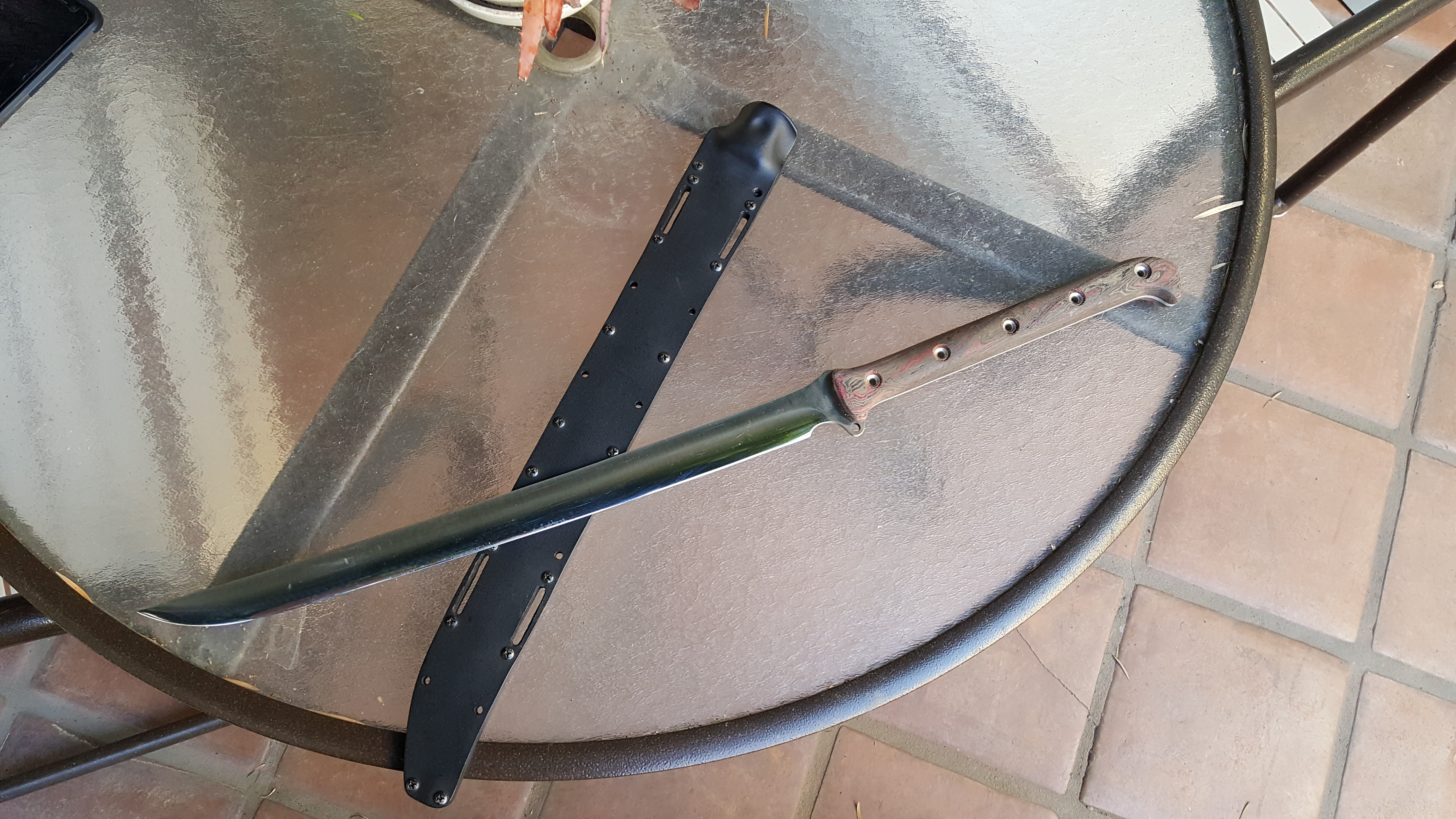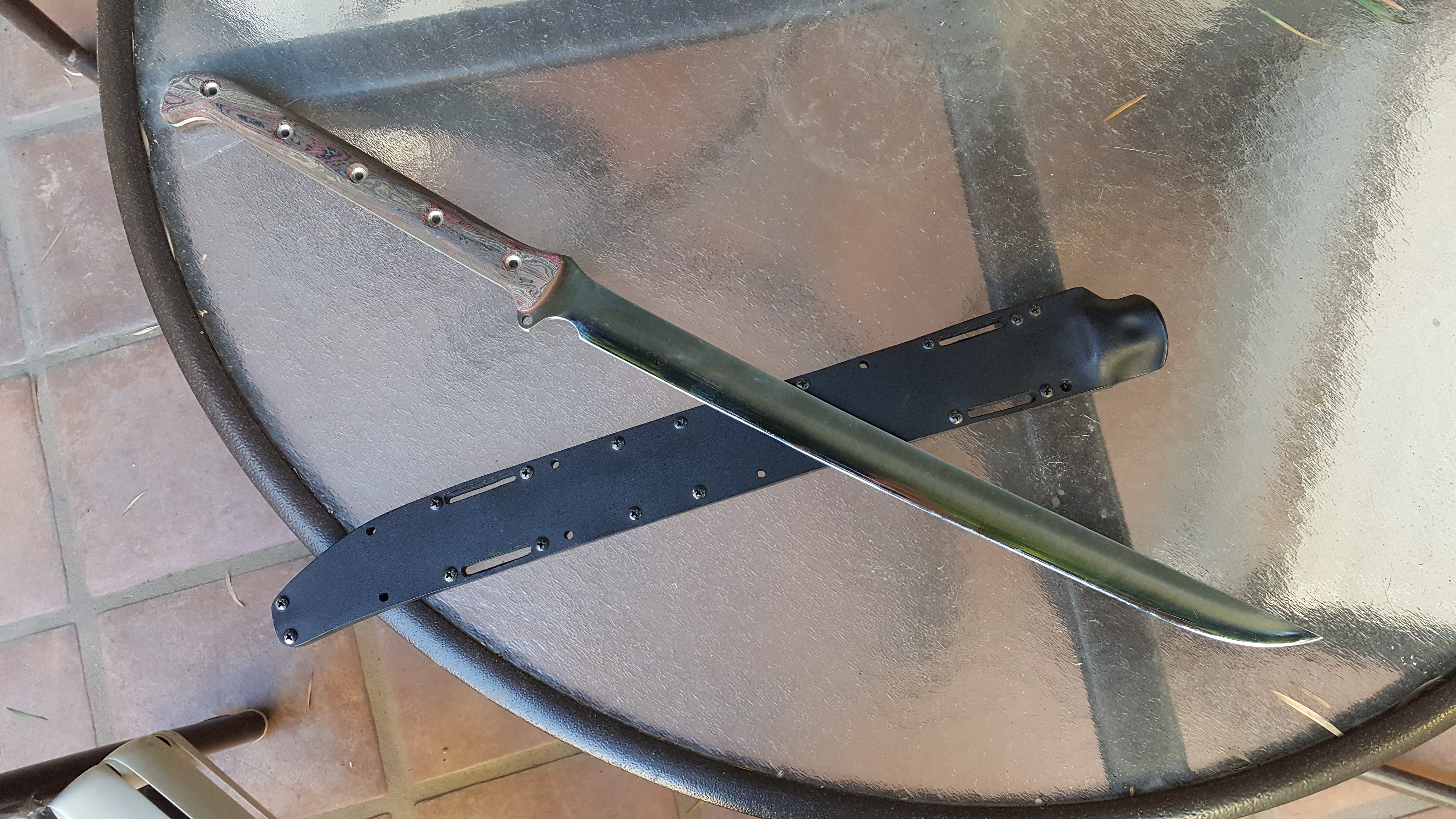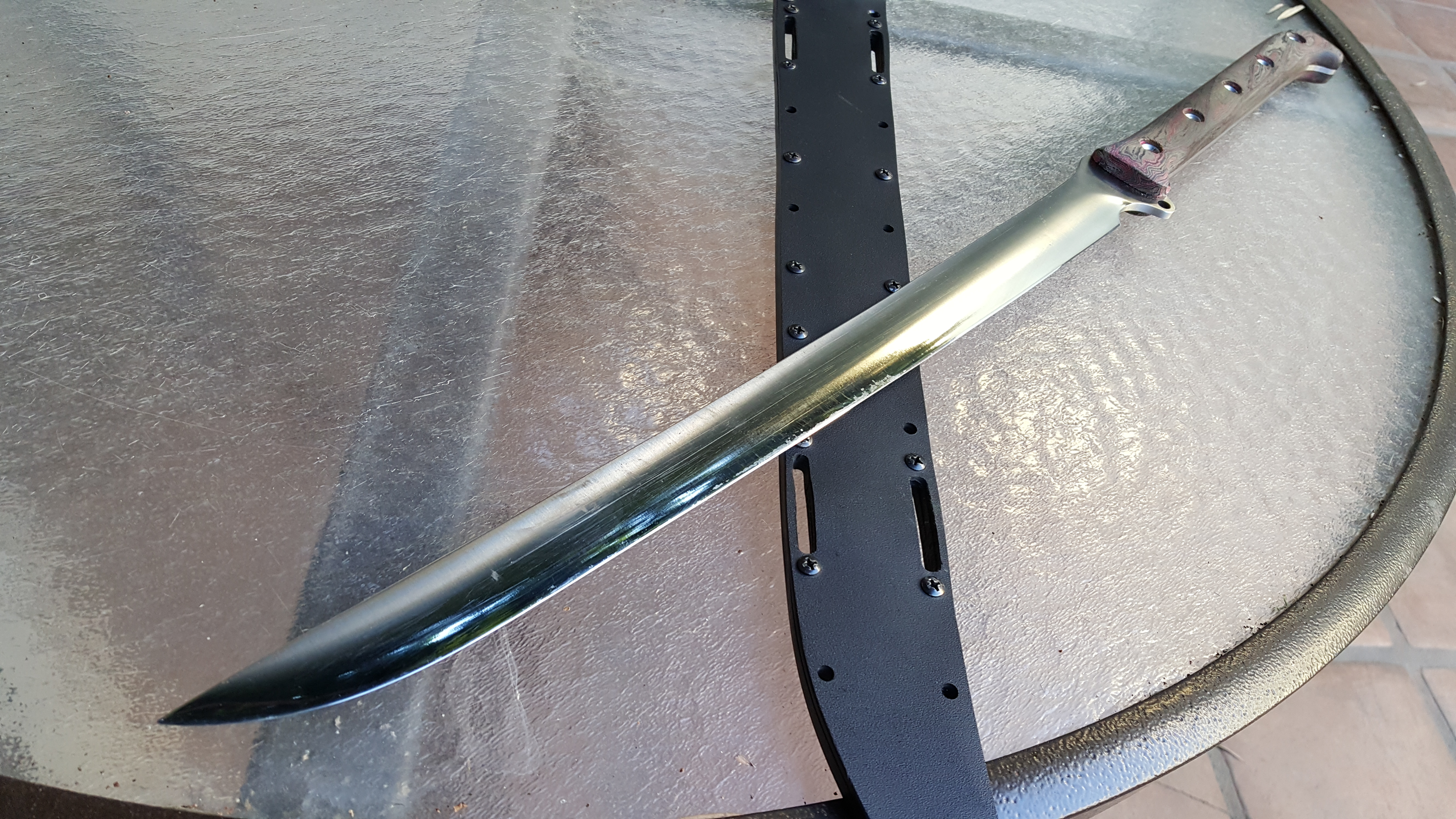 Busse AK-47 w/ full BanTang treatment - Satin finish, regrind with improved geometry and polished convex zero edge, tapered tang, Shadetree canvas/carbonfiber/rag micarta scales, kydex sheath included.