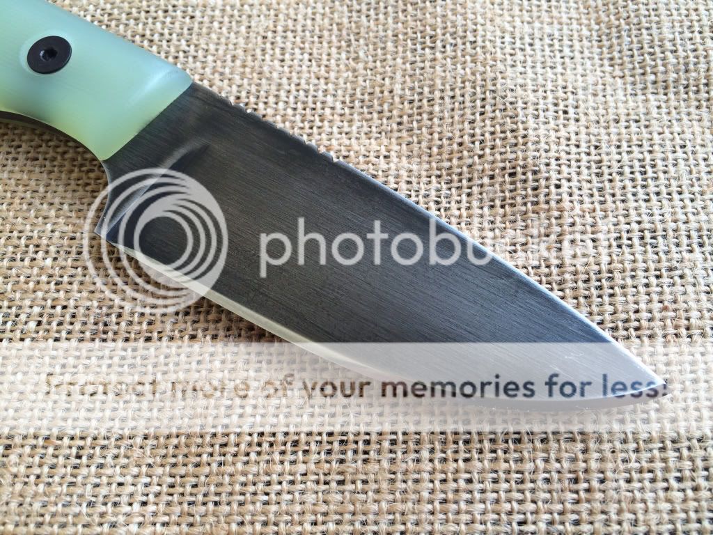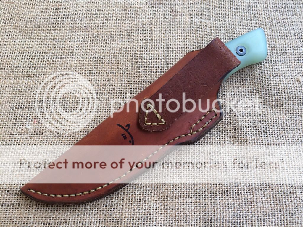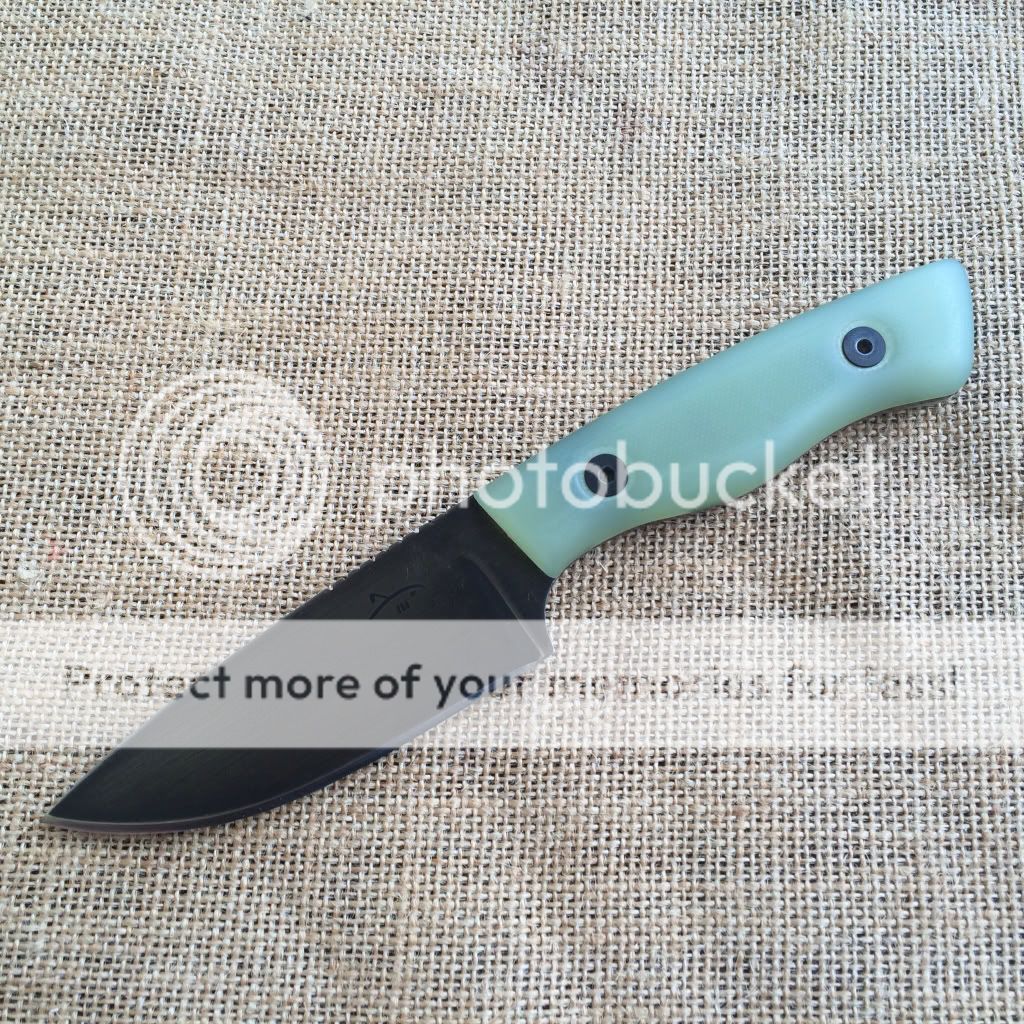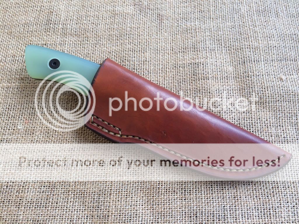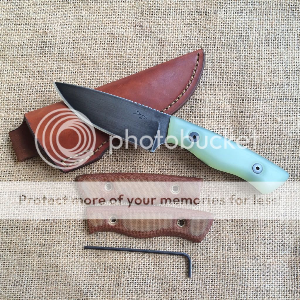 I am selling my Shaerk Mook with Jade green g10 handles and leather sheath. Also included is an extra set of brown canvas micarta handles and Allen wrench for the handle screws. I ordered the knife and extra handles together. I have tried to change the handles once but was not able to remove the g10 handles. Mark told me when I ordered it that changing the handles would probably be a bit difficult due to the handles being pressed on without breaking the g10. They should come off, it just probably takes a bit more force than I used. Mark said they should be able to be pried off carefully as he does it himself. I just want to pass on the same warning that Mark did to me that changing them without cracking the g10 is a bit difficult so I don't want to make any promises about being able to swap them out easily. It is an excellent knife, I just have too many in the same general size. The knife has never been used or sharpened. There are a couple small scratches in the blade finish from being in the sheath. I paid $180 for all of it. I am asking $PF TYD obo. Not interested in trades right now.