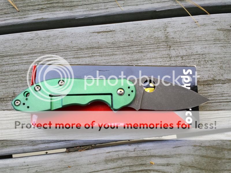 Spyderco Domino with acid etched blade, green anodized rear scale and liners, bead blasted clip. I am second owner, really nice knife, just not going to use it. Looks to be lightly handled (I never carried or used it), anodizing is a nice color but looks a bit uneven in a few places, tried to capture in pictures. Action is smooth, lock up is solid. All in all a nice package, this would make an excellent carry. $135 Shipped Now $120