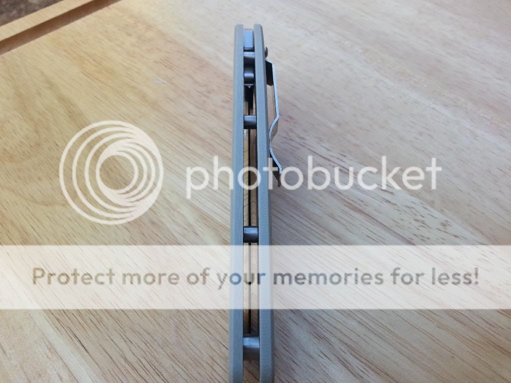 This knife is lightly used but definitely not abused. The handle has some dirt/grim, which with the light gray color looks worse than it is. I'm sure a good wipe down/ scrub, it'll clean up good and new. I reprofiled the edge to 30deg with the sharpmaker all the way up to UF stones, so the edge is nice and sharp. Somewhere along the way, the very tip of the blade broke off. Its so small that I know it will be gone in the next 1 or 2 sharpenings. I tried to capture it in the photos below. Also, the black back spacer was upgraded with matching steel posts for better flow-thru and appearance. The factory bevel isn't even across the entire blade (seems common with this sprint). Blade is just about centered. Good lockup, no blade play, and the movement is very smooth. Blade had been protected with tuff glide and eezox so there's no pits and patina that I see.