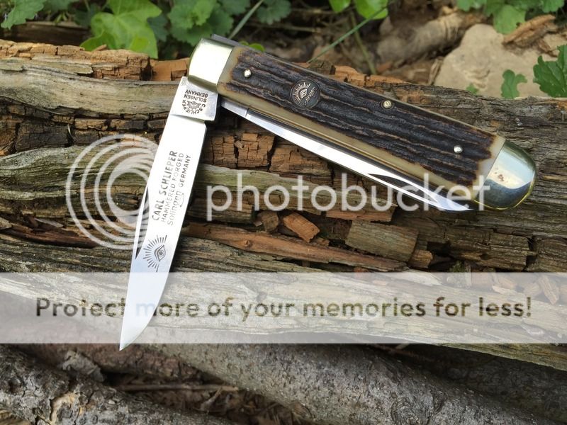 Carl Schlieper trapper. This is a fine German high carbon steel knife with most excellent premium stag covers. Very uniform in color and size. Brass liners and gold chamfered bolsters. Both blades are full and clean. The etch on the main is fully intact. Knife is in good shape overall and the pull is average 5.5/10, good snap both ways on both blades.These knives patina easily and get super sharp. Look at that stag!