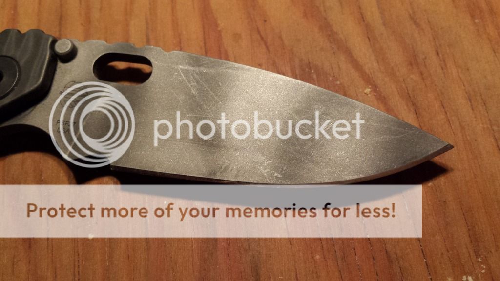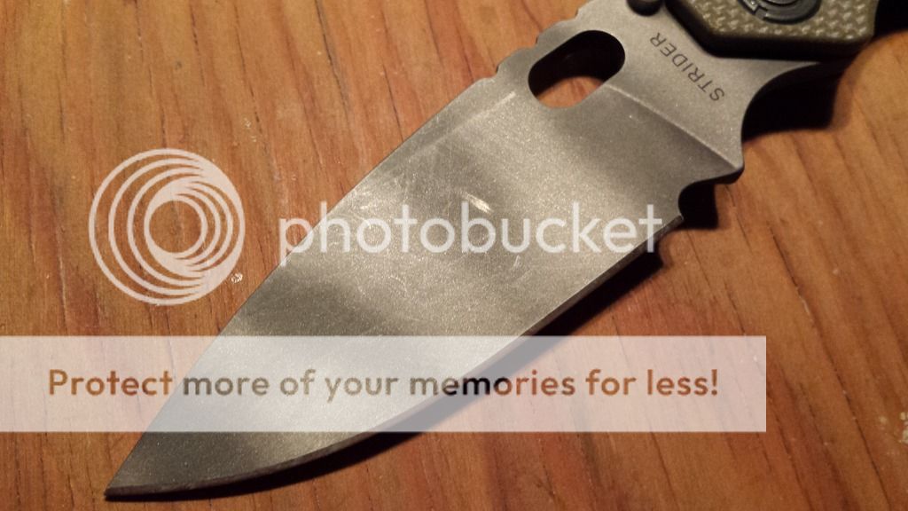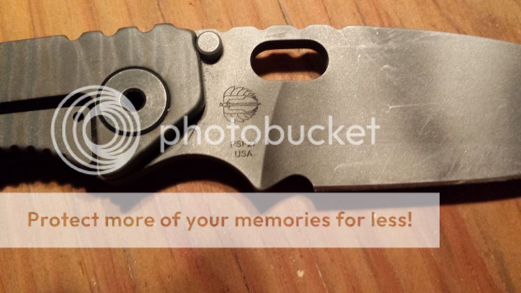 Since PSF27 is not stainless, the blade is DLC coated as well as ghost striped. The coating shows some scratches as well as the flamed Ti. Just the nature of the finish on these. The PSF27 is an amazing steel that seems to hold an edge forever. I have only needed to hone this on some white SM rods free hand, and the rest of the time I used my strop.