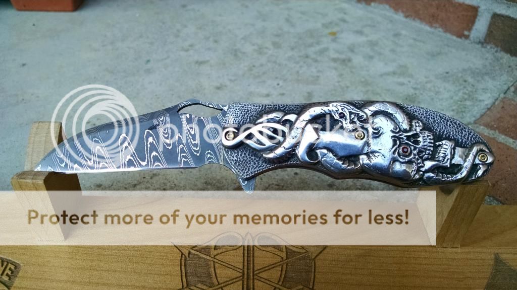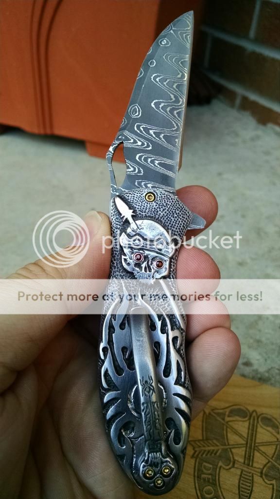 Lastly!!!! Doing a 180 in style...this one is a incredible hand carved Damascus Flipper...Flames, skulls, Snakes, Spiders, and Tribal Flames...6.5 inches OAL. Wicked!! And check the spine on this one!!!! $1500 OBO........