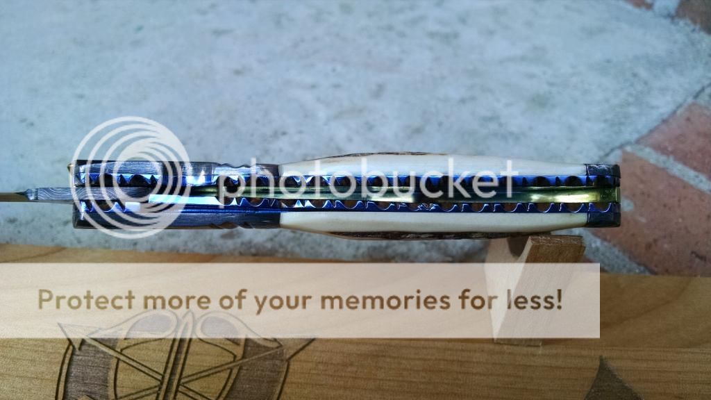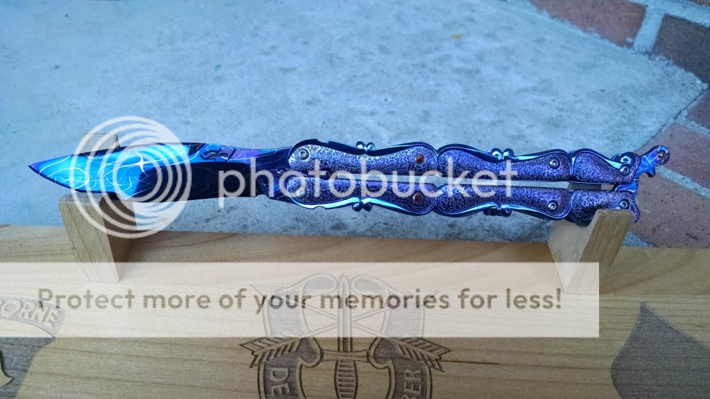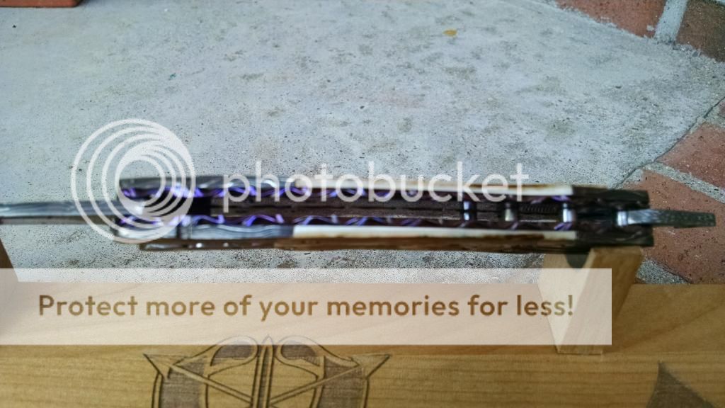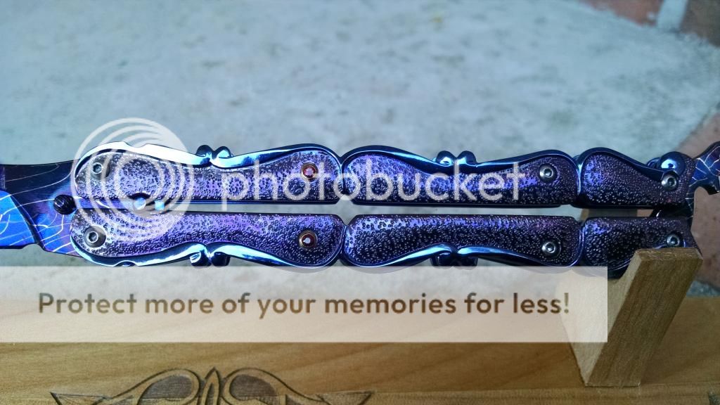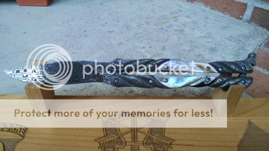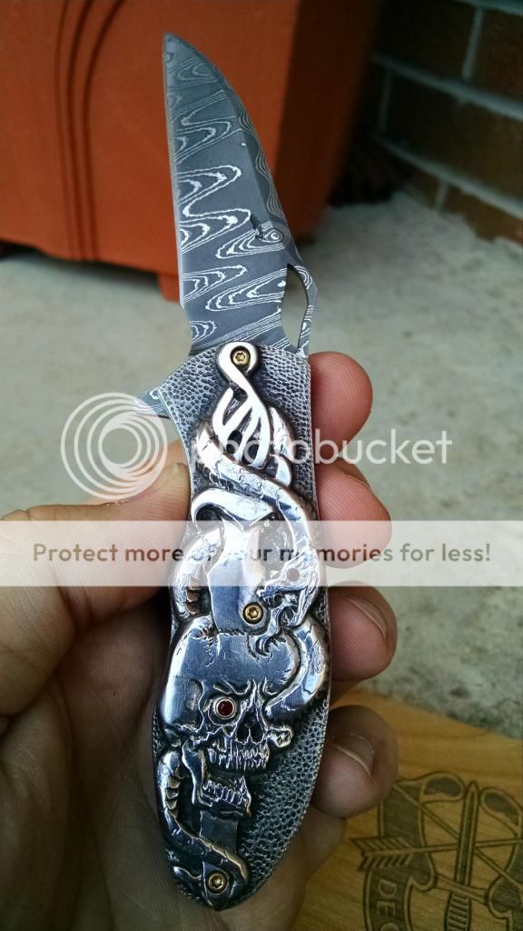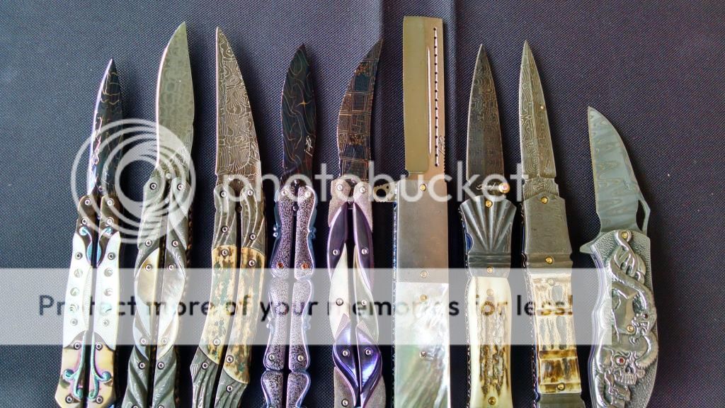 Ok....let's break it down. My first offering is an Incredible Suchat Balisong. This blade has an overall length of seven inches The blade is an incredible Robert Calcinor Blue Damascus. The handle is carved pearl with Tahitian inlays. Handle material is beautifully carved and peened vine In Titanium. Liner is hand chiseled and compliments the blade nicely. This Blade is $1500 usd OBO.