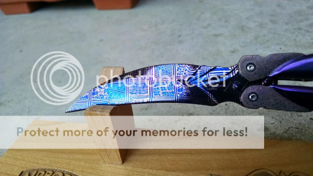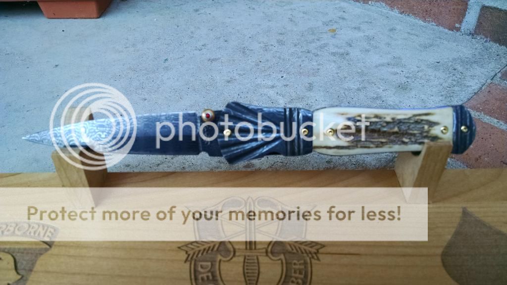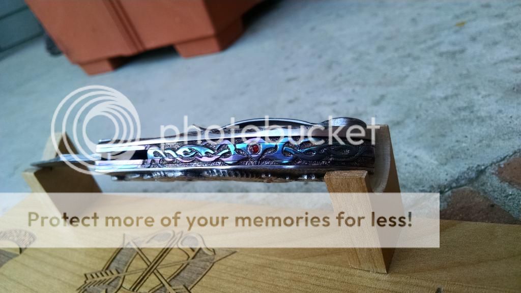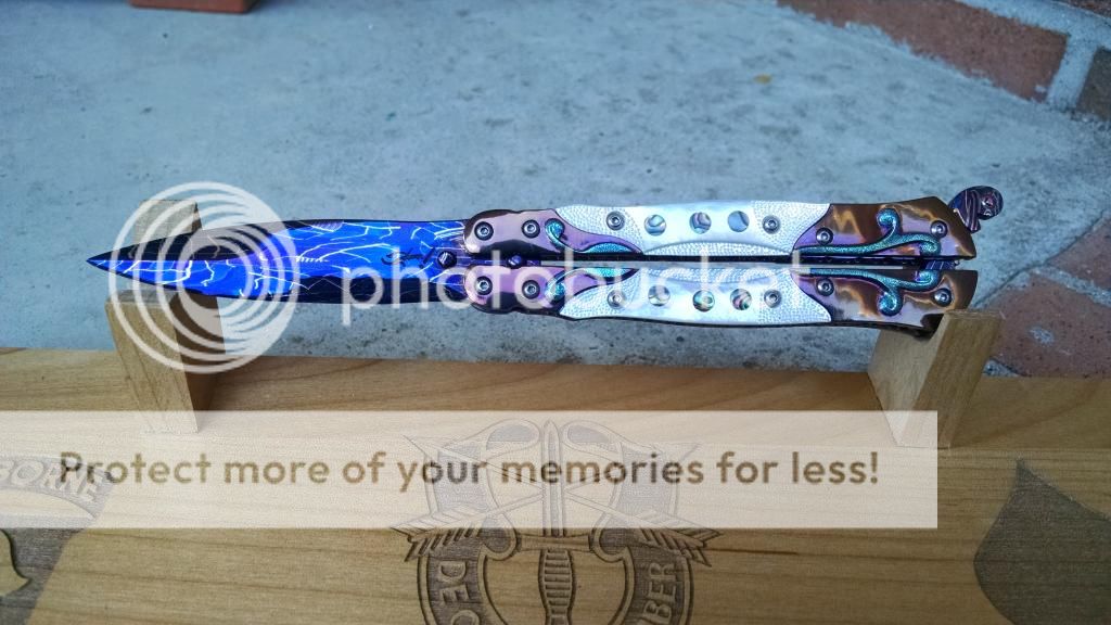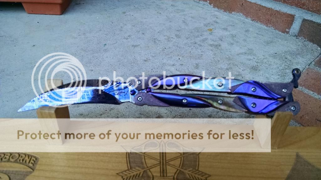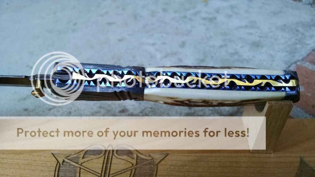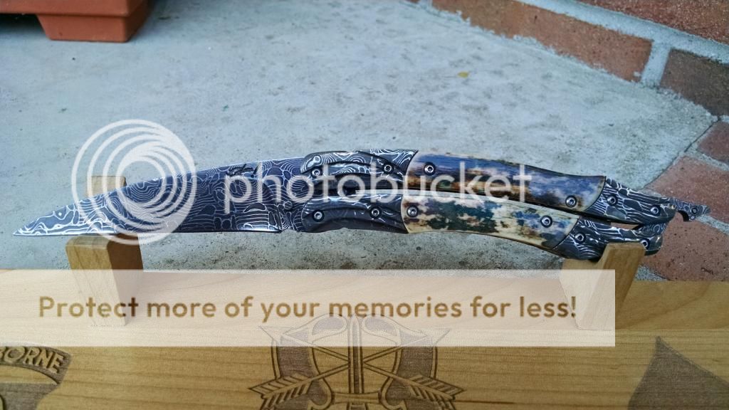Ok....let's break it down. My first offering is an Incredible Suchat Balisong. This blade has an overall length of seven inches The blade is an incredible Robert Calcinor Blue Damascus. The handle is carved pearl with Tahitian inlays. Handle material is beautifully carved and peened vine In Titanium. Liner is hand chiseled and compliments the blade nicely. This Blade is $1500 usd OBO.