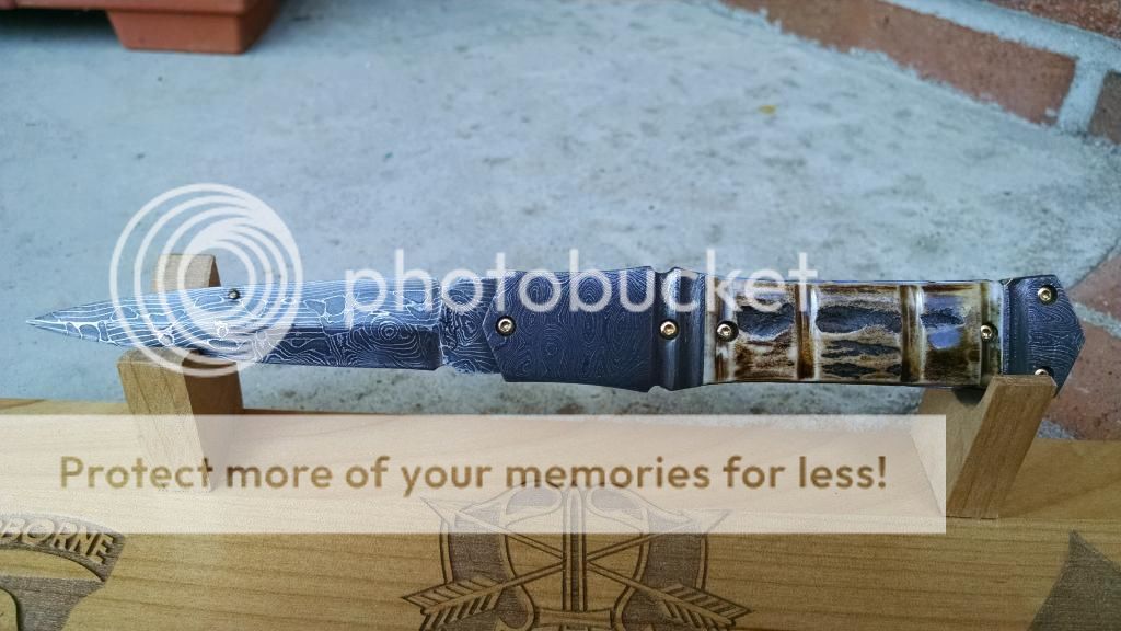OK Another Suchat with Robert Calcinor Damascus. Gentlemans Folder. Blade and a bolsters are Damascus. Again....this one has an Incredible Spine!!!! 8 inches OAL. This one also is adorned with Mamouth scales!!!! SImply Beautiful!!!!