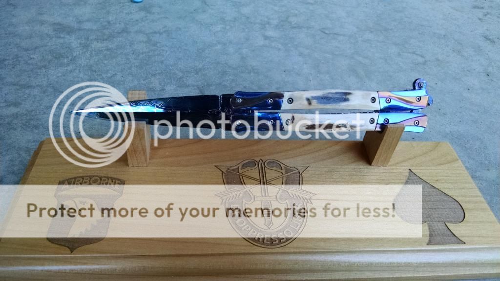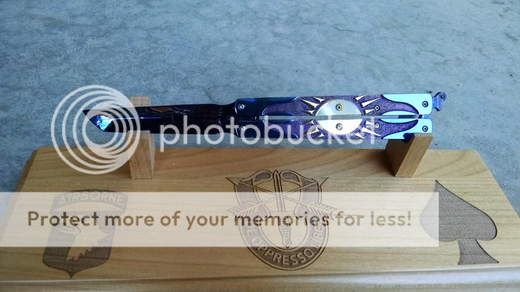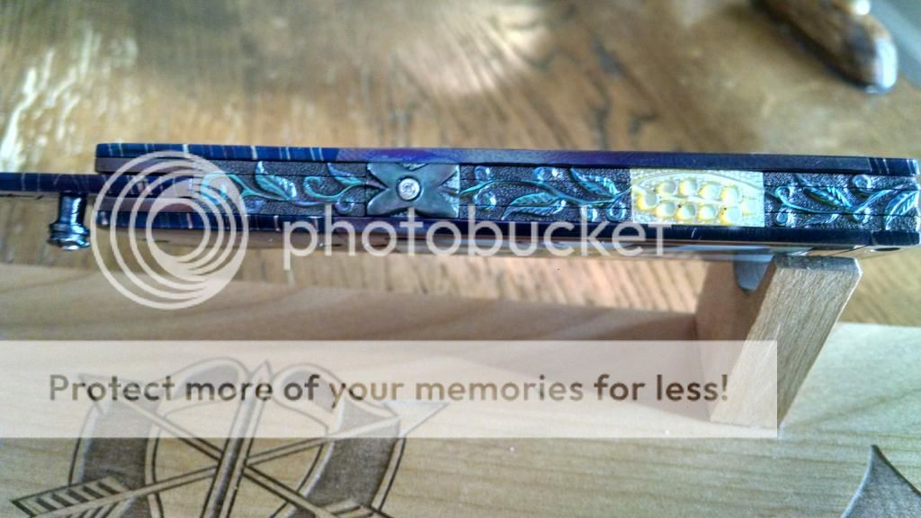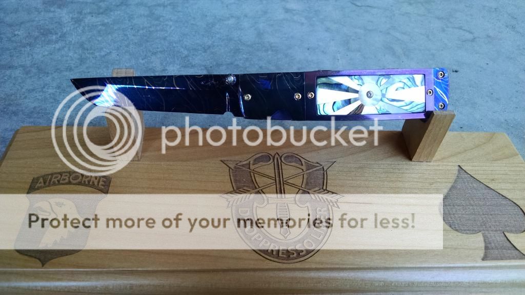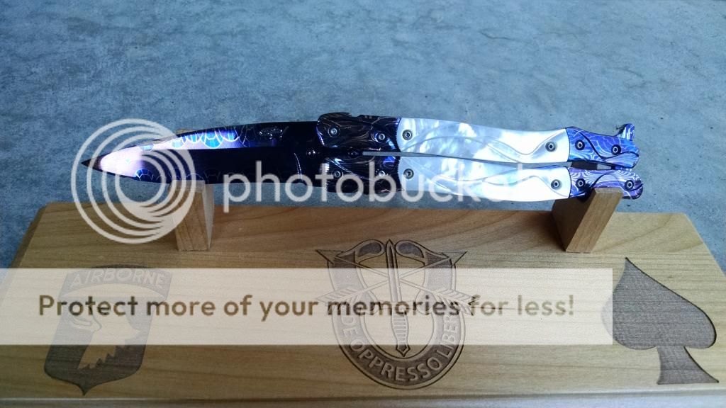 Ok....let's break it down. My first offering is an Incredible Suchat Balisong. This blade has an overall length of seven inches The blade is an incredible Robert Calcinor Blue Damascus. The handle is carved pearl with Tahitian inlays. Handle material is beautifully carved and peened vine In Titanium. Liner is hand chiseled and compliments the blade nicely. This Blade is $800 usd OBO.