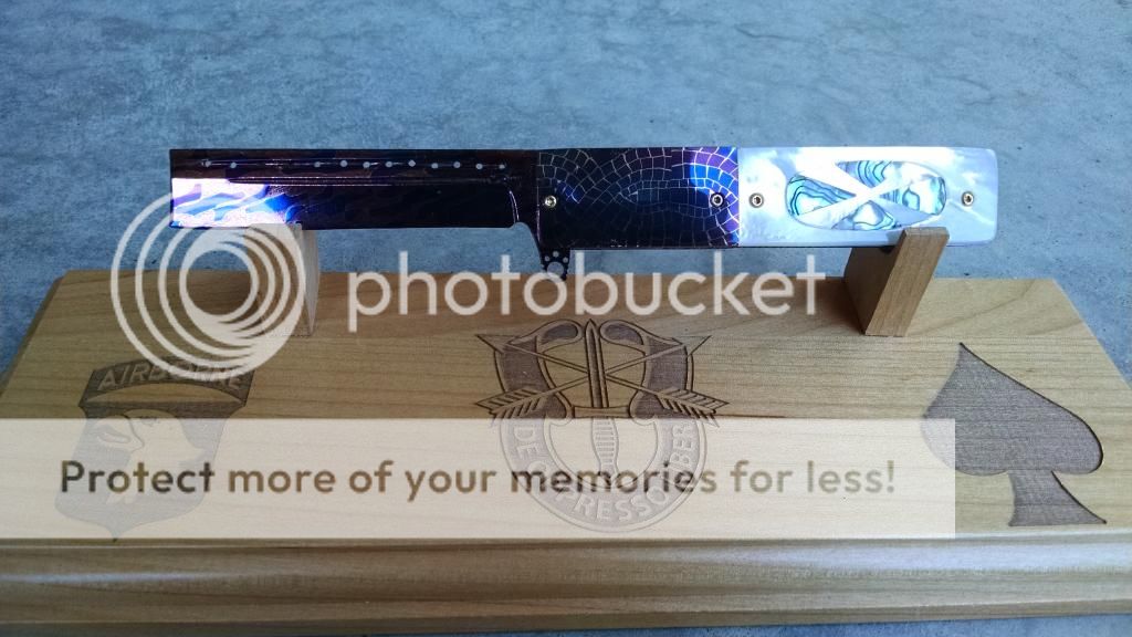 OK....This one is pretty incredible!!! Robert Calcinor INCREDIBLE Blue Mosaic Damascus!!!! Persian Design with an OAL at 7.75. Peened Titanium Bolsters and Beautiful Pearl Inlay. Offered at $900 usd OBO.