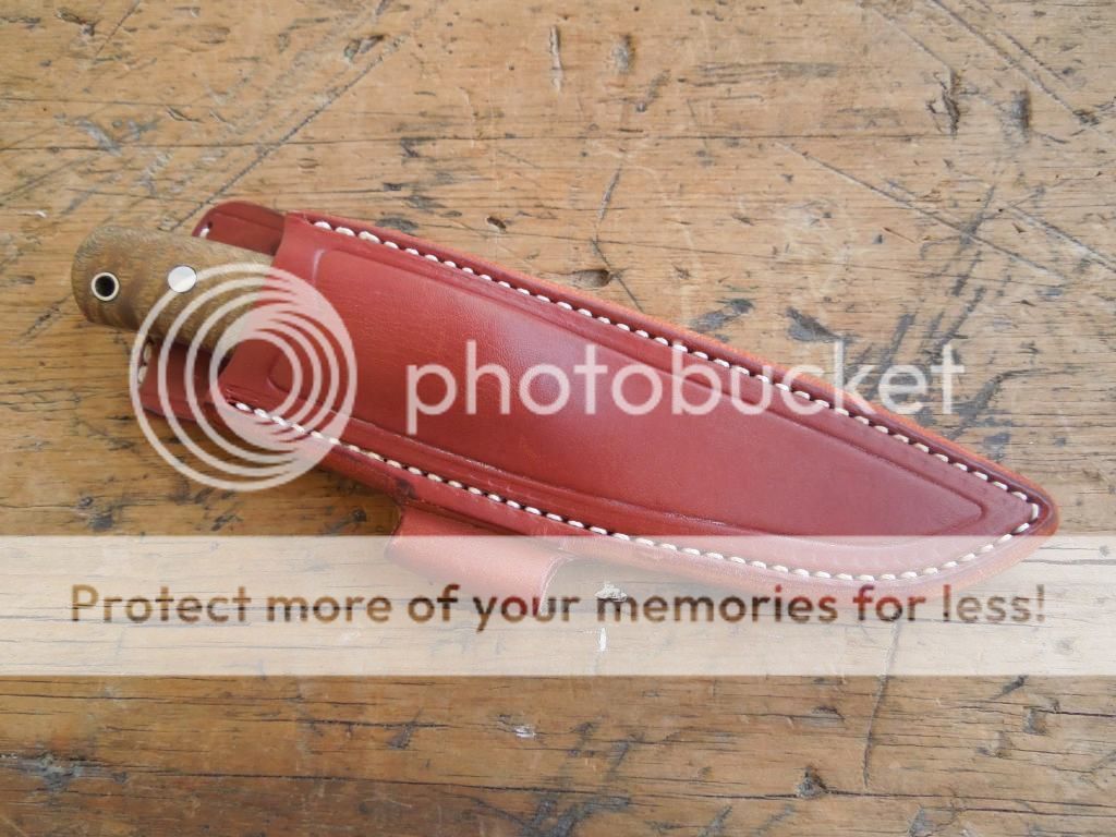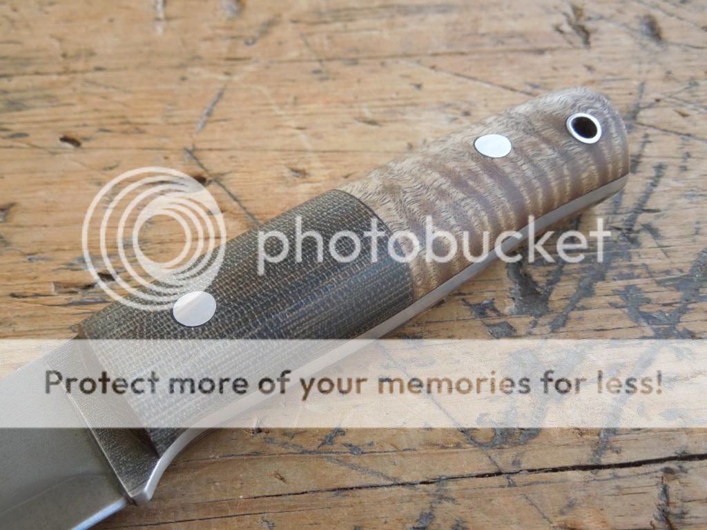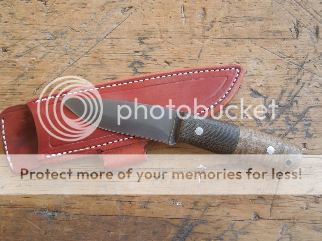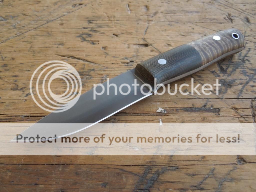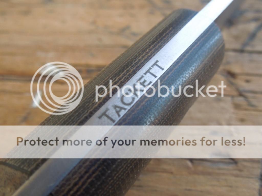 For sale is a Tackett custom fixed blade - I don't know much about this one as I am the second owner. It has green micarta and wood handles (Not sure exactly what type of wood it is but the grain is gorgeous). The knife has been used lightly, and there are some marks on the spine and top of the side of the blade from striking a fire steel. The wood on the grip has also shrunk slightly so the the grips aren't completely flush on the tang and pins, but it's not too bad and doesn't feel uncomfortable to me. The blade length is 4 inches and OAL is 8 inches. I am including a KSF belt sheath with fire steel loop. The sheath shows some wear and some of the glue is coming undone, but still has some life left in it. $130 obo... Now $105 TYD