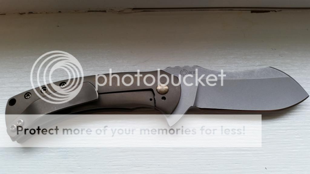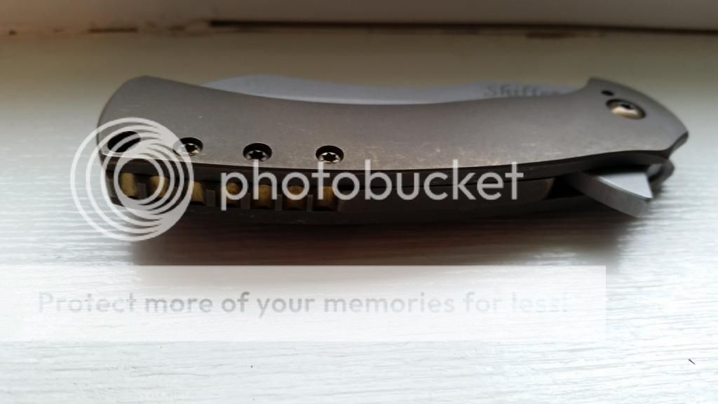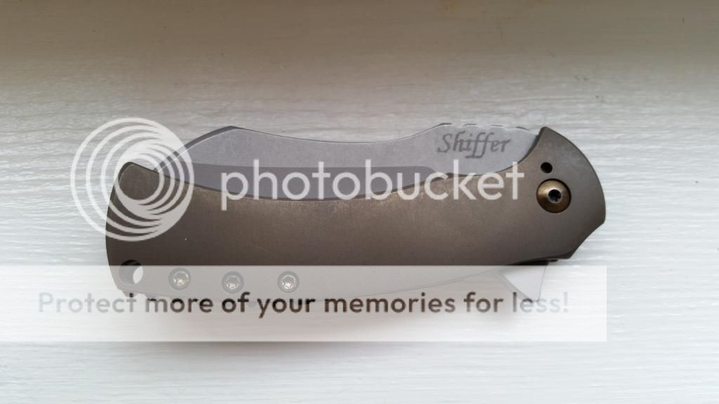 3" CPM154 Blade, IKBS, 7-1/4" Overall, Ti Handles. This is an awesome 3″ IKBS Framelock Flipper from Doc Shiffer of MS and is 1 of 10 made! Excellent F&F, perfect centering, fast deployment & lock-up is early at 10%. Handles and Clip have been Deep Bronze ano’d and stonewashed and are beautiful! The CPM154 Blade has been Blasted & then Tumbled! Pivot Screw, and Handle Screws have polished Gold color ano work! Custom matching file work on the Backspacer & Jimping on Blade look Fantastic!