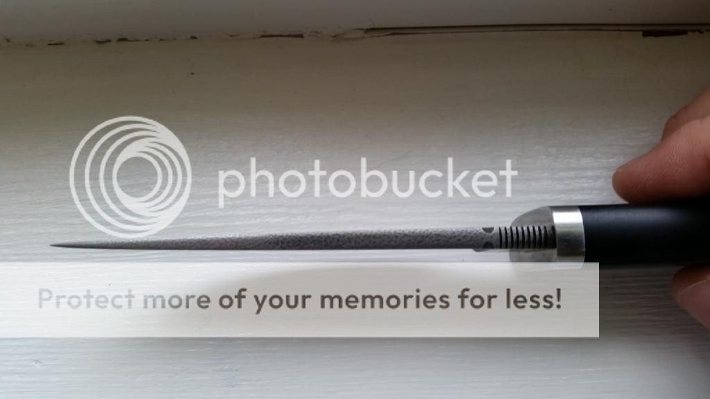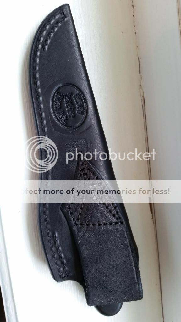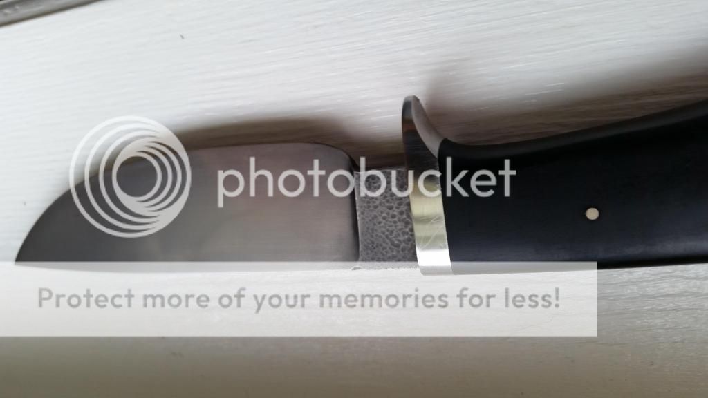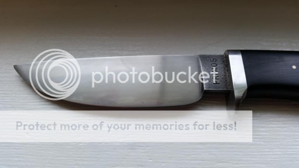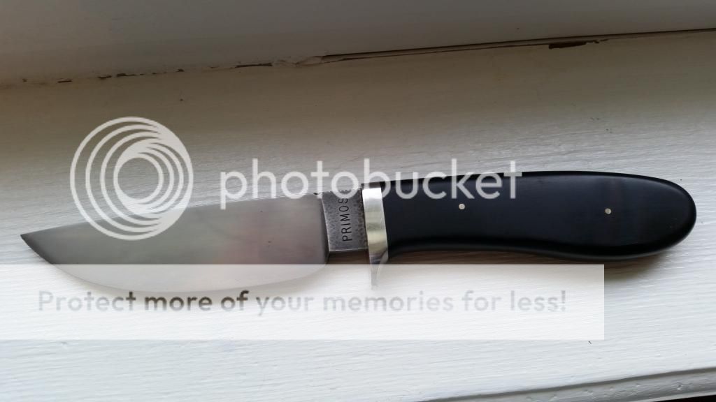 Primos Ebonywood Hunter. 1084 steel w/a nice Hamon. 4-3/8" Blade (Razor Sharp) and 8-3/4" Overall. SS 1/2 guard (slight scratches but very surface level), Ebonywood handle in great condition. No cracks or splits. Beautiful Black leather Kenny Roe sheath. There are a couple very faint carbon spots on the blade. No pitting or rust whatsoever. Some really cool dimple texturing on the blade. Very nice distal taper on blade.