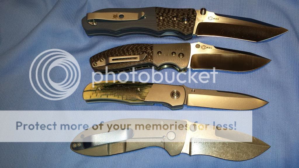 1. New Kirby Lambert Inferno.IKBS. dual studs. MGT grind!Not sure of blade material used.(2013 model) fuller on blade(never seen one like this) Blue ano standoffs, CF bolster, blue G10 scales..Amazing knife!