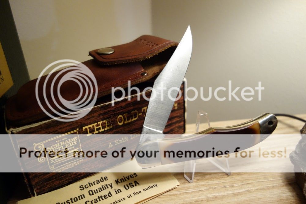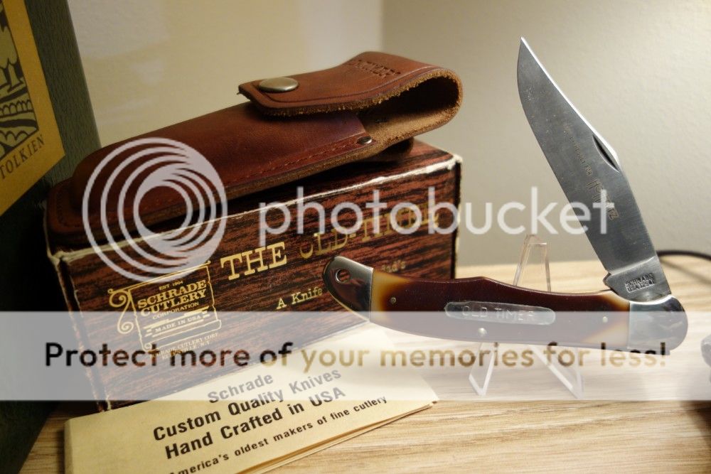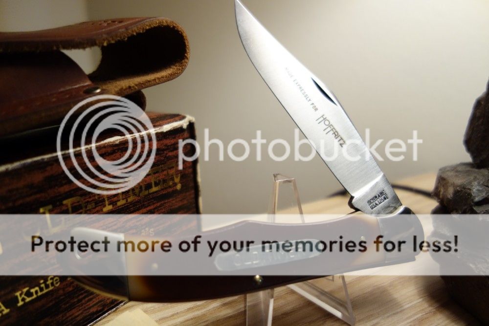 -Schrade Old Timer 125OT "Mustang" singe blade folding hunter. Brand new in the original box with leather sheath and paperwork. Has "made expressly for Hoffritz" on blade. Carbon steel. $82 shipped.