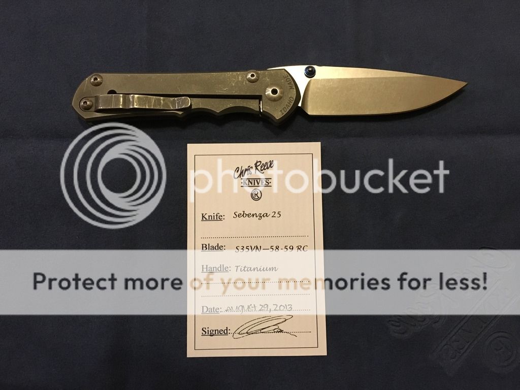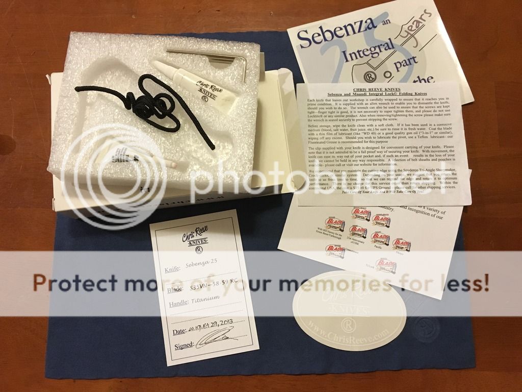 I have a Sebenza 25 for sale. It is used. It has been carried a lot. It has developed "character". Its still quite sharp. It comes with everything pictured below. Centering is spot on, action is smooth and lockup is just as the day I bought it. Asking $325.00. Paypal only. I ship USPS with tracking. I will cover the shipping and the fees, not looking to trade for anything. PM me and post here to claim it. Thanks for looking.