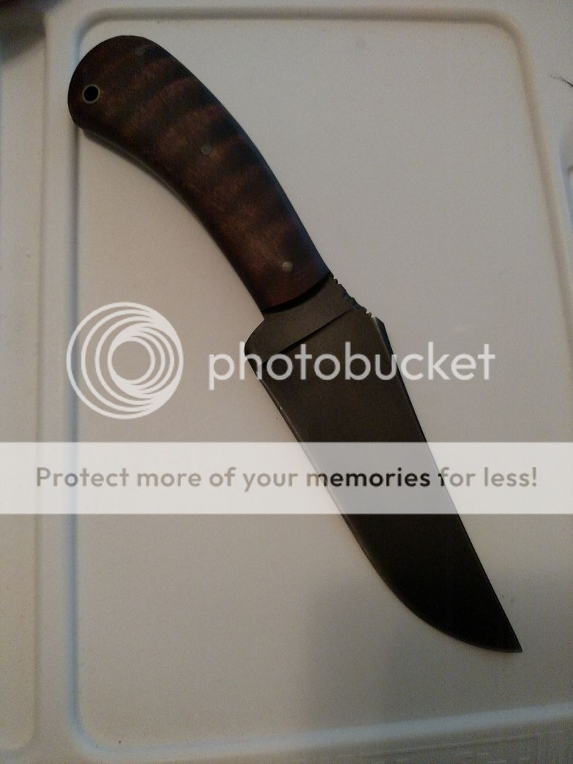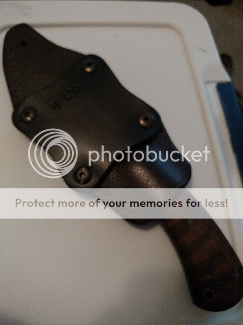 Next: Daniel Winkler Belt Knife. Curly maple handle, has some dings from carry and some from his shop. Blade has a bit of finish wear from being removed from the sheath but other than that the knife is in great shape. Comes with box, papers, adjustments for the sheath, etc. Asking $315 OBO.