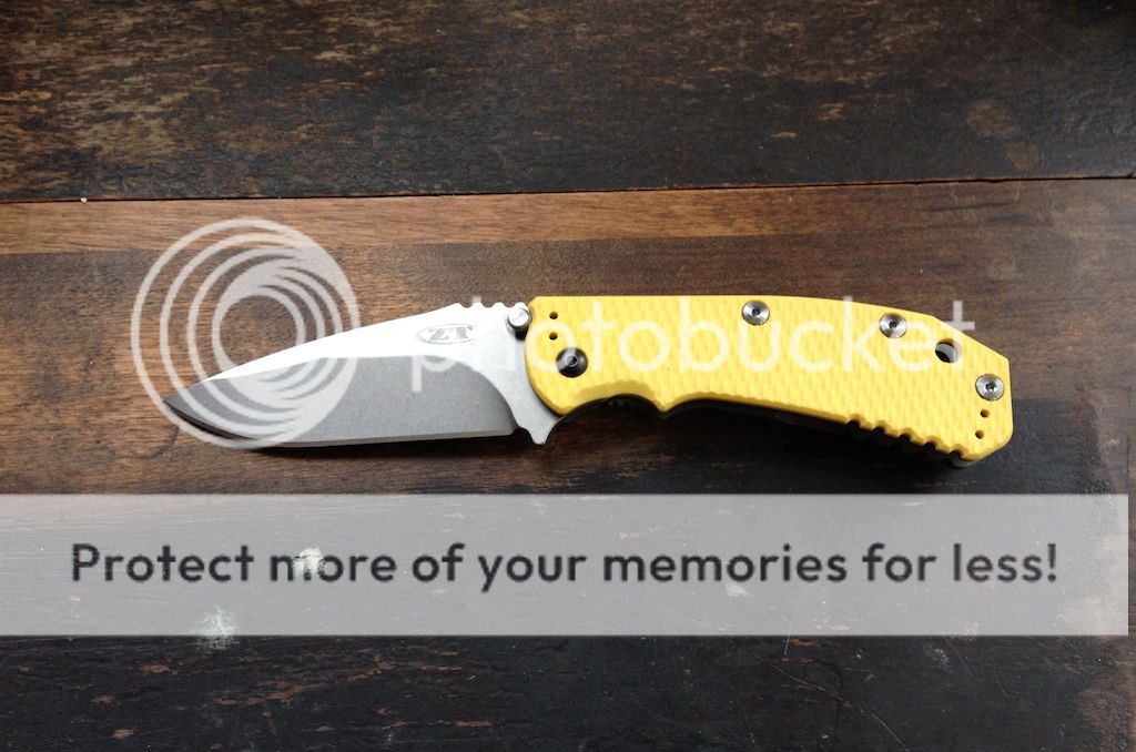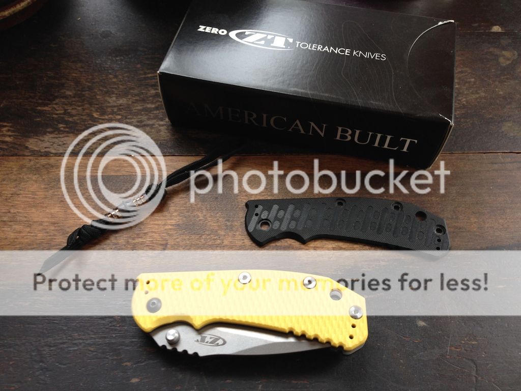 Set includes Hinderer-made yellow G-10 scale, 6 Hinderer XM-18 handle screws, original ZT G-10 scale and screws, Hinderer bronze anodized titanium lanyard, ZT box/packaging.