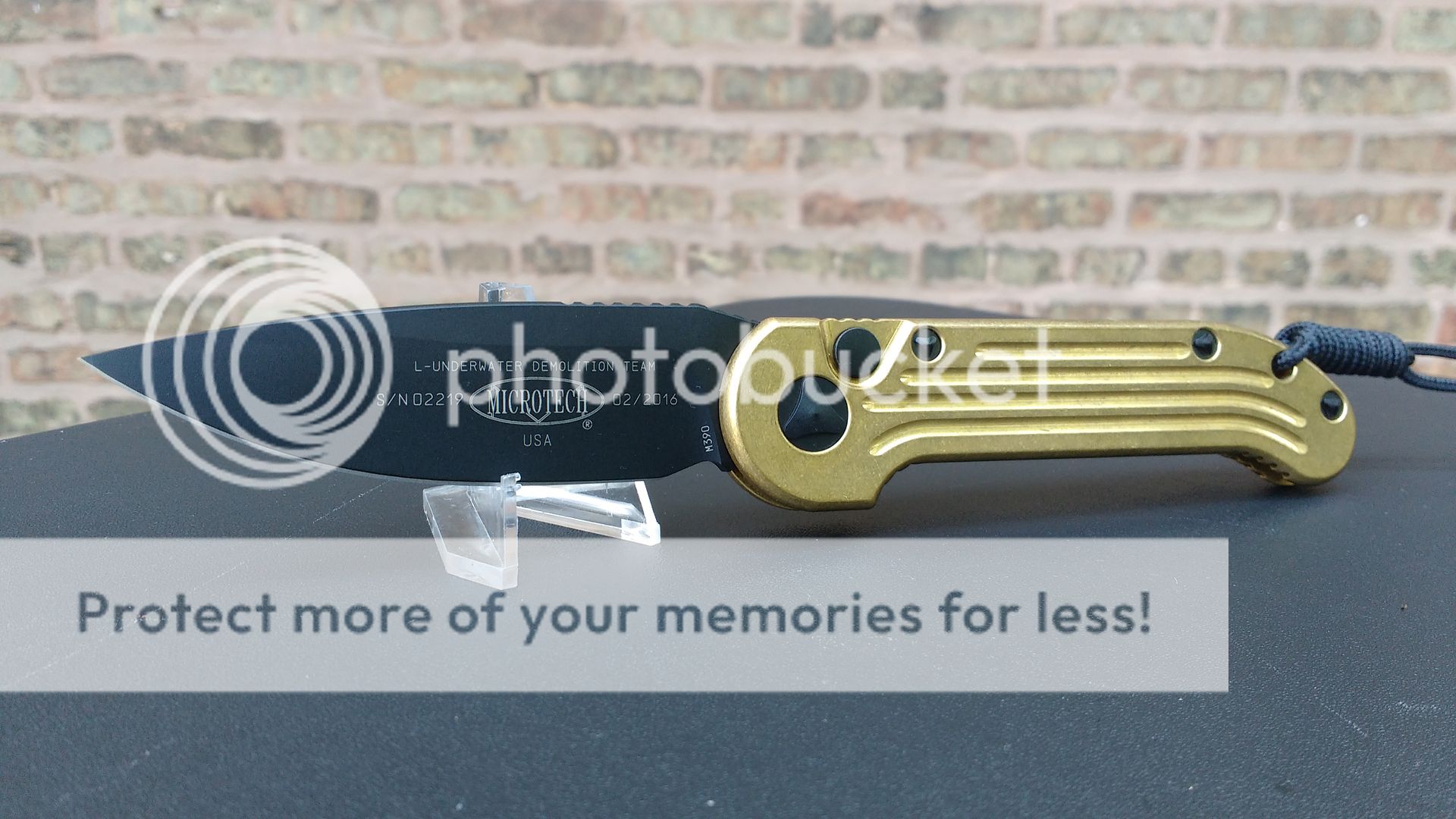 Like new overall condition. Just about indistinguishable from new. Handles are made completely of brass. All black hardware. Blade steel has been upgraded to M390. Blade is dead nuts centered, absolutely zero blade play in any direction, neither of which is a given with most automatic knives. Blade fires out fast and hard. Comes with box, papers & baggie. Sells for $375-400 online.